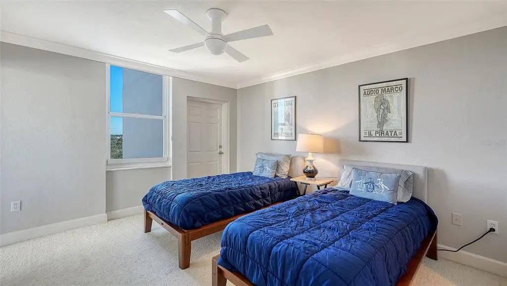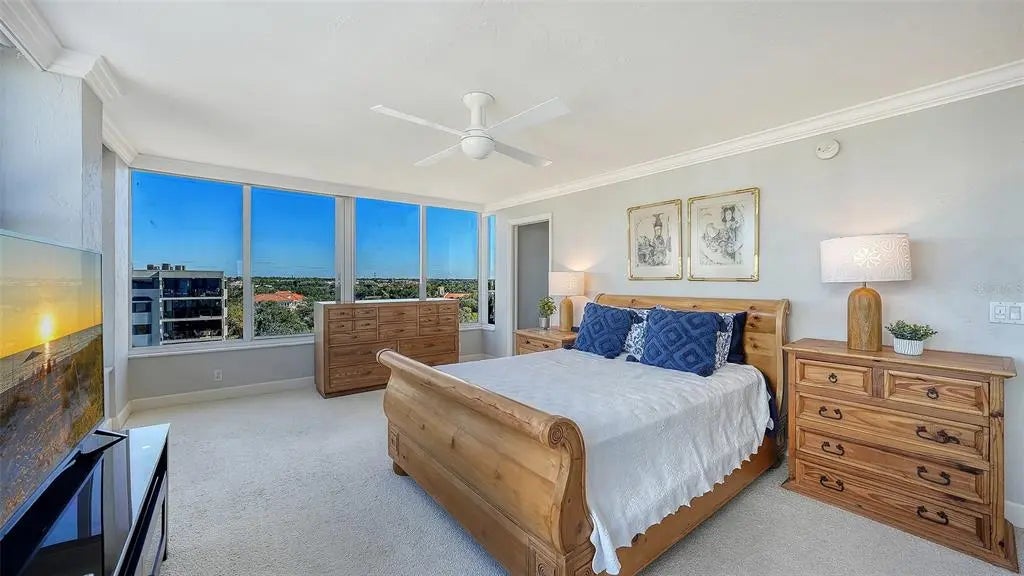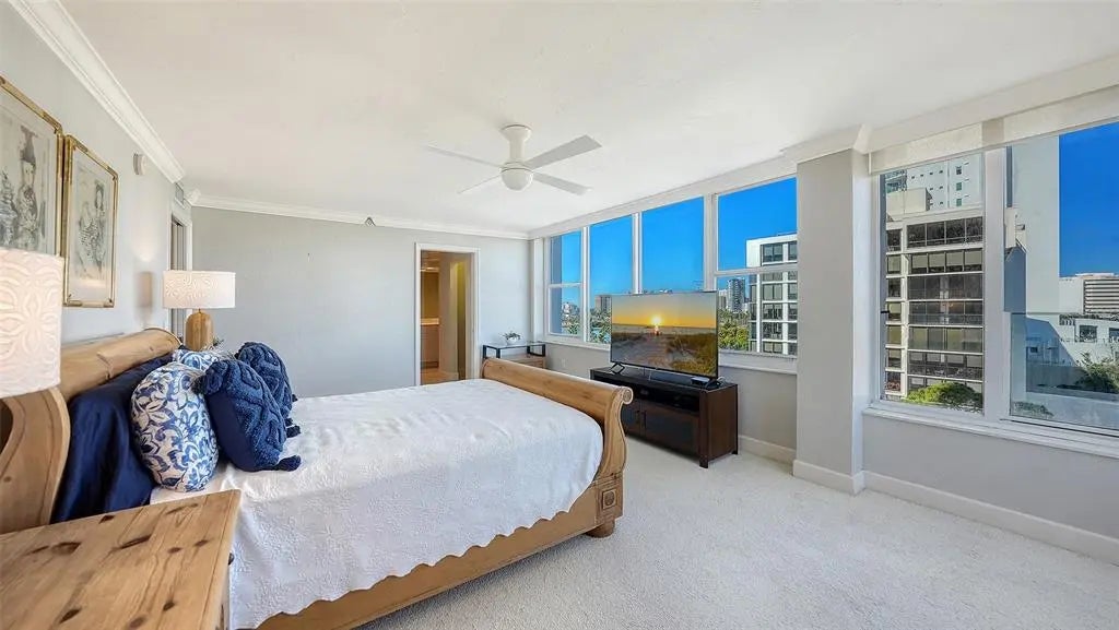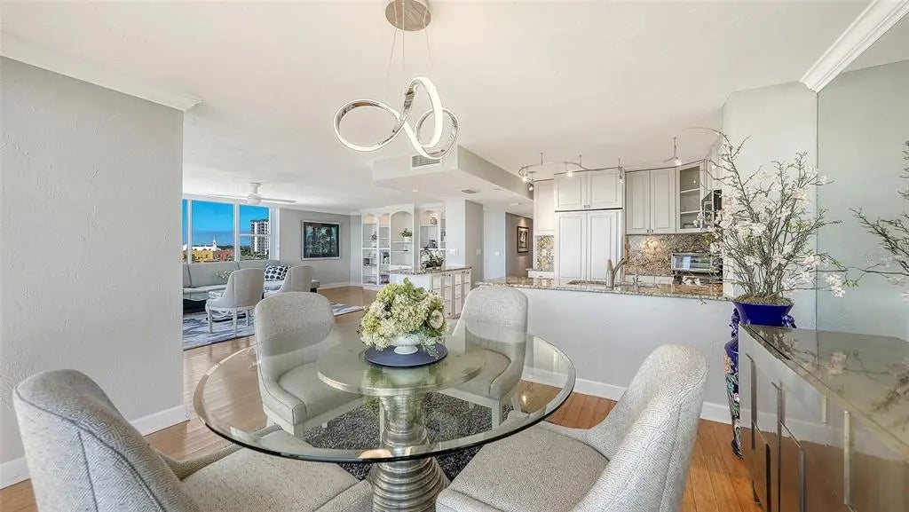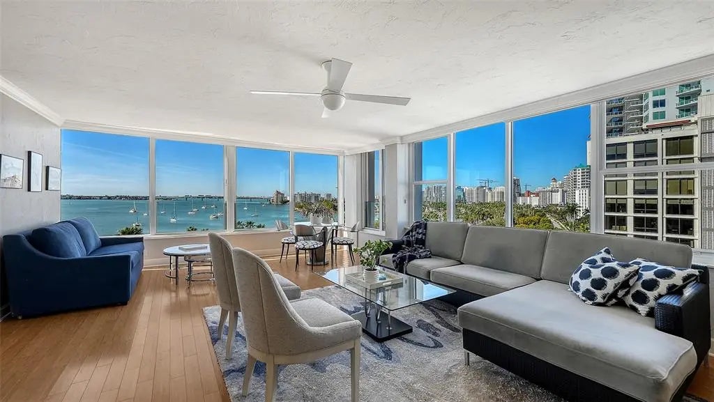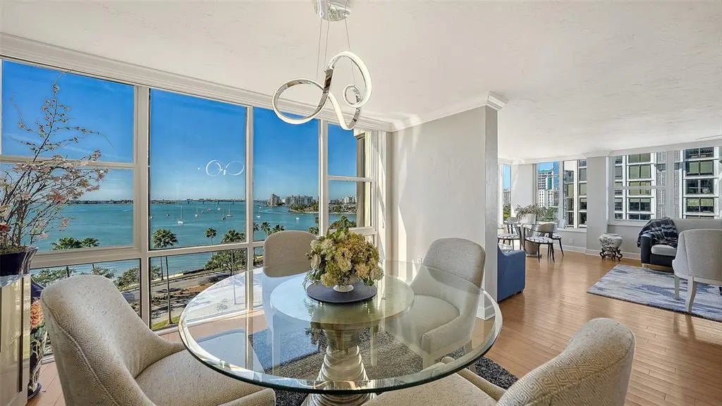 Perched on the 7th floor, this exceptional residence delivers truly breathtaking panoramic vistas. Set within a landmark building designed for refined downtown living at the quiet end of Palm Avenue, the residence enjoys a premier location along the Bayfront with sweeping views of Sarasota’s most sought-after scenery. From the sparkling bay and sailboats lining Bayfront Park to the John Ringling Bridge, Golden Gate Point, Bird Key, Lido and Siesta Keys, the Gulf waters, and Selby Gardens—every direction offers a postcard-worthy outlook. A semi-private elevator entry welcomes you into a beautifully furnished condo with uninterrupted water views unfolding as you step inside. The expansive living spaces feature an open, flowing layout anchored by a dramatic 30-foot expanse of west-facing glass and wood flooring. Living, dining, kitchen, and sitting areas are all designed to showcase the ever-changing scenery, from glowing sunrises to unforgettable sunsets. Enjoy floor to ceiling bookshelves in the great room. The kitchen has custom granite countertops, stainless appliances, insta-hot water, white glass-front display cabinets, and extraordinary storage. Views from the primary suite span from the Bayfront to the heart of the city. A generous size bath and walk-in closet are pluses. The guest quarters and bath provide the perfect retreat for your guests. Embassy House is a secure and meticulously maintained example of modern architectural design. Its recently refreshed lobby and amenities reflect a sophisticated mid-century modern aesthetic, complete with bespoke furnishings and carefully selected artwork. Residents enjoy an impressive collection of amenities, including a bay-view fitness center, conference space with kitchenette, a renovated heated pool, guest parking, electric vehicle charging, car wash station, grilling area, and outdoor dining spaces. Whether your ideal day involves quiet mornings with coffee overlooking the water, hosting evening gatherings with cocktails, or strolling to nearby cafés, restaurants, shops, galleries, the bayfront, Selby Gardens, or the Saturday Farmers Market, this location supports every lifestyle. This is where elevated coastal living truly begins.