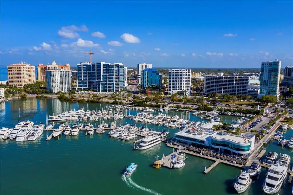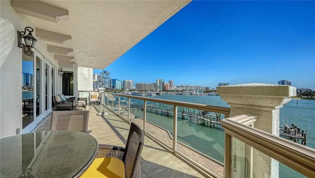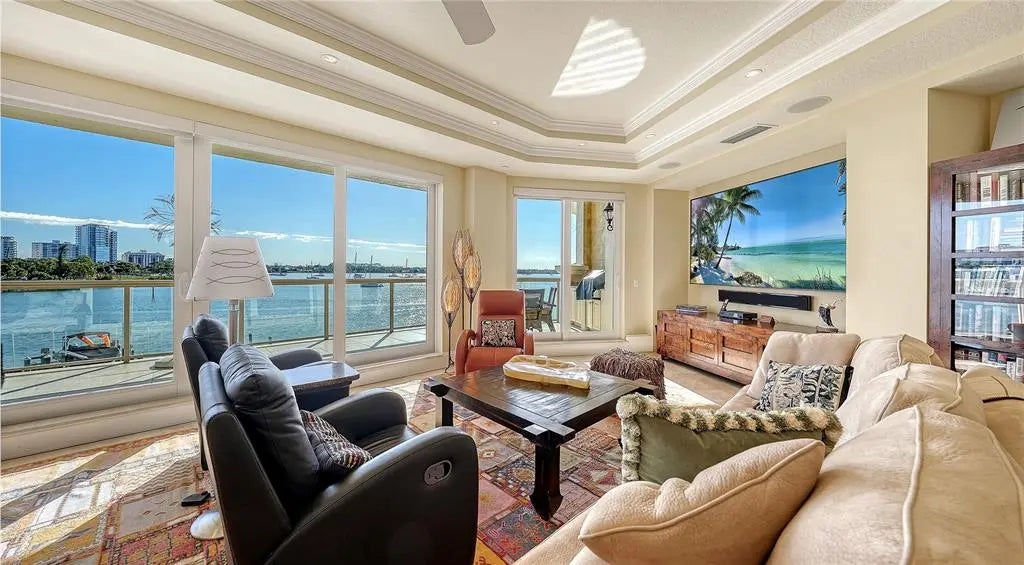 Positioned on the third floor of La Bellasara, this expansive waterfront residence offers refined living on Sarasota Bay with panoramic views of the marina, open water, and the downtown skyline. Spanning approximately 3,290 square feet of interior living space plus several generous terraces, Residence #304 delivers the scale and privacy of a single-family home within one of downtown Sarasota’s most respected boutique enclaves. A private elevator opens directly into the residence, welcoming you into a gracious foyer that leads to the Grand Salon—an impressive living and dining space framed by floor-to-ceiling glass and some 11-foot tray ceilings. Marble flooring, crown molding, gas fireplace, wet bar with wine cooler, and thoughtful architectural detailing create a timeless backdrop for entertaining and daily living, while expansive sliding doors extend the living space onto the large waterfront salon terrace overlooking the bay and marina. The kitchen is designed for both function and style, featuring solid wood cabinetry, stone countertops, a central island with breakfast bar seating, pantry storage, and premium appliances including a gas cooktop, built-in ovens, wine refrigeration, and custom shelving. The open dining room area enjoys water views, making it a natural gathering point throughout the day. The primary suite is a true retreat, offering a dedicated bayfront terrace, dual walk-in closets, and marble his and her bathrooms. Two additional bedroom suites are thoughtfully separated for privacy, each with balconies, walk-in closets and en-suite baths. The study/library (with closet) provides flexible space for a home office, quiet reading room, or fourth bedroom. Desirable conveniences to complement this perfectly placed residence include a private two-car garage, secure storage, and your own dock with lift. La Bellasara residents enjoy a gated setting with on-site management, fitness center, resort-style pool and spa, and many community amenities, all within a ten-minute walk to the heart of Sarasota’s city center. Located on coveted Golden Gate Point, La Bellasara places you moments from downtown Sarasota’s cultural and culinary scene. Enjoy nearby Marina Jack, Selby Gardens, Burns Court, The Bay Park, and the city’s acclaimed theaters, galleries, and waterfront dining. St. Armands Circle and Lido Beach are just minutes away, offering effortless access to shopping, recreation, and Gulf beaches.