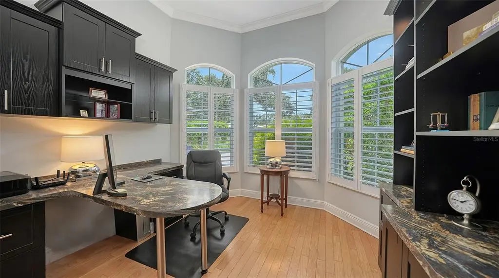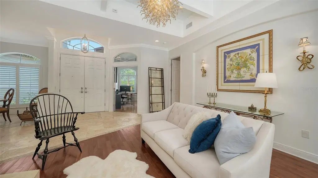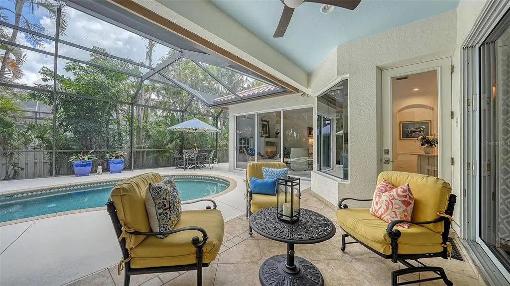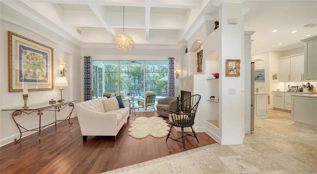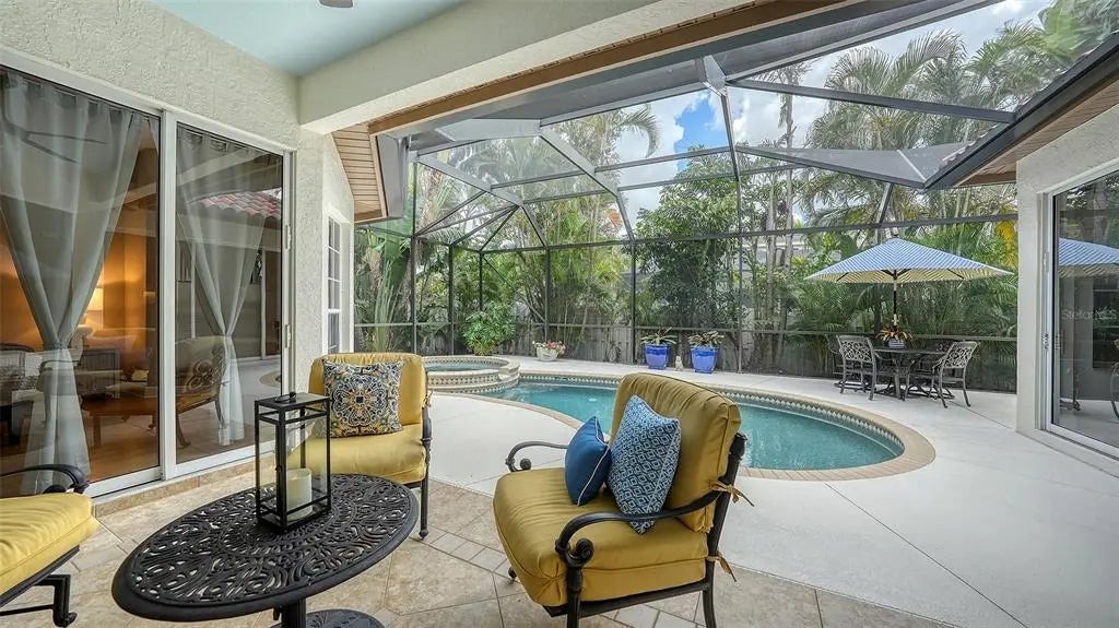 GREAT LOCATION – WEST OF THE TRAIL! This dazzling custom-built, single-level pool home is situated in the desirable "flower streets”, west of the trail in Sarasota. Featuring a new, 3 color clay tile roof and Mediterranean style design this home has timeless style combined with modern luxury. Upon entering the double doors of this one-story retreat, you will notice the open layout and quality appointments that abound with tray and coffered ceilings, custom built-ins and niches, gas fireplace, gorgeous and rare coquina stone floors. This 4 bedroom (one a custom designed office), 3 bath, 3-car garage home features a new island kitchen with custom and glass front cabinets, stainless steel appliances, decorative backsplash and beautiful quartz counters. The tranquil primary retreat overlooks the lanai and pool and features a walk-in closet with built in closet system, wood floors and an incredible ensuite bath. This newly renovated primary bath exudes luxury with custom cabinetry, upscale finishes, and features a walk-in shower for a spa-like experience. The split floor plan showcases two additional guest bedrooms (one with a custom Murphy bed and office) each with access to newly renovated bathrooms. The high ceilings and 3 sets of sliding glass doors flood the open floor plan with natural light, while custom finishes and soft contemporary décor create an atmosphere of effortless sophistication. The very private lanai with a screened pool, new pool heater, fiber optic lighting, Pebble tec finish, pool bath and outdoor shower is surrounded with lush vegetation, perfect for entertaining and outdoor relaxation. The home is wired for high-speed internet access and streaming services. There is an installed security system that protects both pool and home. The paver driveway and side-entry 3 CAR garage adds additional built-in storage, a 2nd refrigerator and fabulous curb appeal. Upscale landscaping and lighting complement the architectural design and tropical setting. When you want to enjoy the neighborhood, you are minutes away from downtown Sarasota’s cultural scene, Siesta Key Beach, Southside Village shops and restaurants. Located in the Southside Elementary School District and steps away from Sarasota Memorial Hospital’s main campus, this home has it all -- a sanctuary feel AND all the amenities you desire at your fingertips.