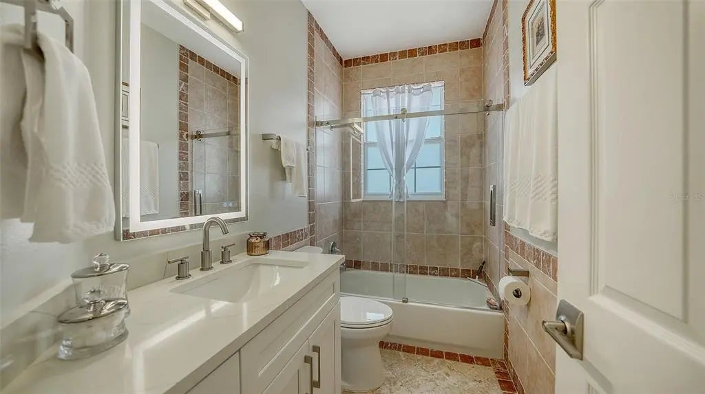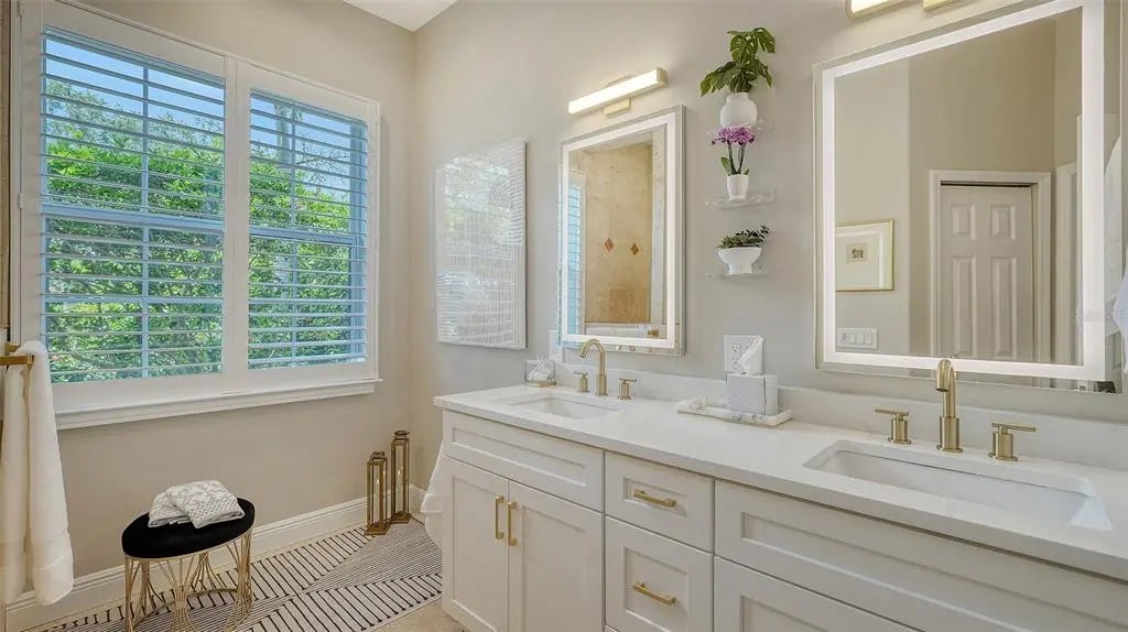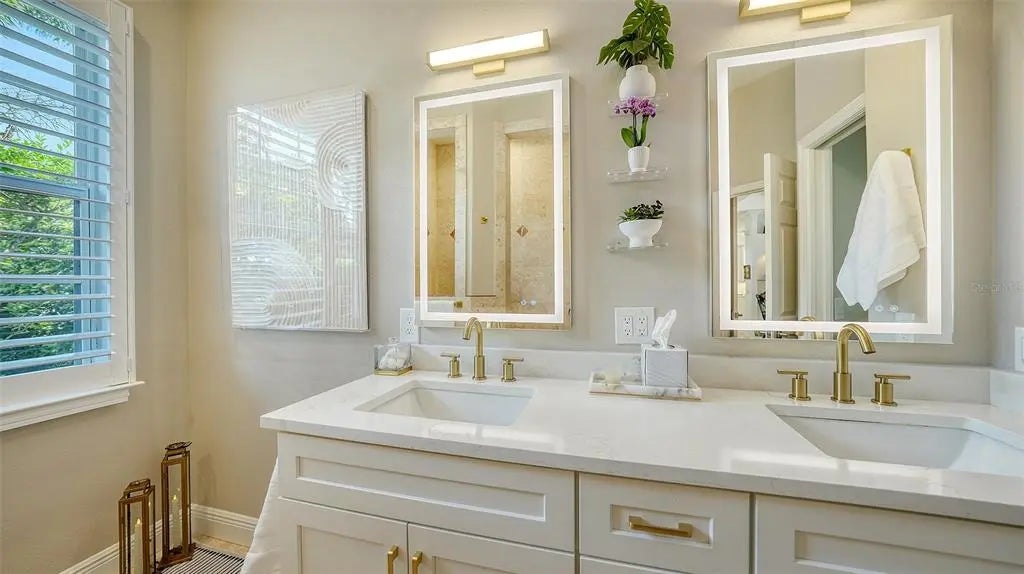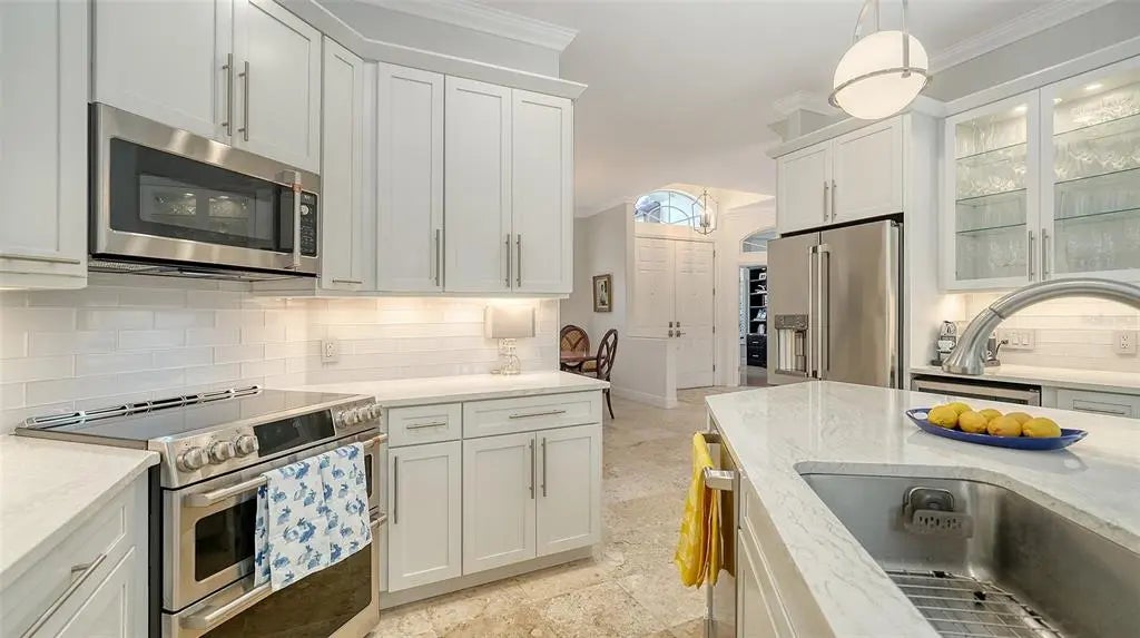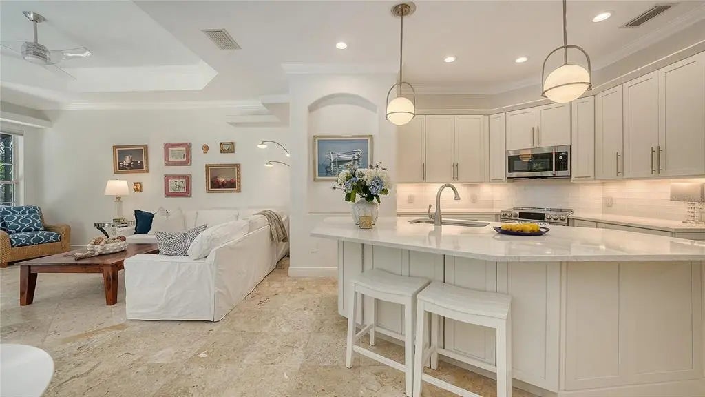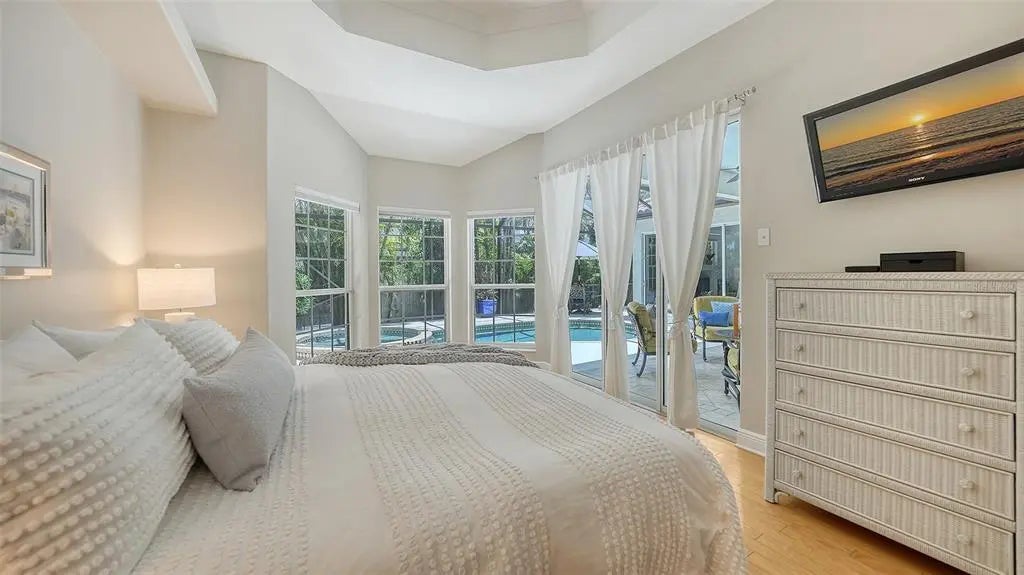 GREAT LOCATION – WEST OF THE TRAIL! This dazzling custom-built, single-level pool home is situated in the desirable "flower streets”, west of the trail in Sarasota. Featuring a new, 3 color clay tile roof and Mediterranean style design this home has timeless style combined with modern luxury. Upon entering the double doors of this one-story retreat, you will notice the open layout and quality appointments that abound with tray and coffered ceilings, custom built-ins and niches, gas fireplace, gorgeous and rare coquina stone floors. This 4 bedroom (one a custom designed office), 3 bath, 3-car garage home features a new island kitchen with custom and glass front cabinets, stainless steel appliances, decorative backsplash and beautiful quartz counters. The tranquil primary retreat overlooks the lanai and pool and features a walk-in closet with built in closet system, wood floors and an incredible ensuite bath. This newly renovated primary bath exudes luxury with custom cabinetry, upscale finishes, and features a walk-in shower for a spa-like experience. The split floor plan showcases two additional guest bedrooms (one with a custom Murphy bed and office) each with access to newly renovated bathrooms. The high ceilings and 3 sets of sliding glass doors flood the open floor plan with natural light, while custom finishes and soft contemporary décor create an atmosphere of effortless sophistication. The very private lanai with a screened pool, new pool heater, fiber optic lighting, Pebble tec finish, pool bath and outdoor shower is surrounded with lush vegetation, perfect for entertaining and outdoor relaxation. The home is wired for high-speed internet access and streaming services. There is an installed security system that protects both pool and home. The paver driveway and side-entry 3 CAR garage adds additional built-in storage, a 2nd refrigerator and fabulous curb appeal. Upscale landscaping and lighting complement the architectural design and tropical setting. When you want to enjoy the neighborhood, you are minutes away from downtown Sarasota’s cultural scene, Siesta Key Beach, Southside Village shops and restaurants. Located in the Southside Elementary School District and steps away from Sarasota Memorial Hospital’s main campus, this home has it all -- a sanctuary feel AND all the amenities you desire at your fingertips.