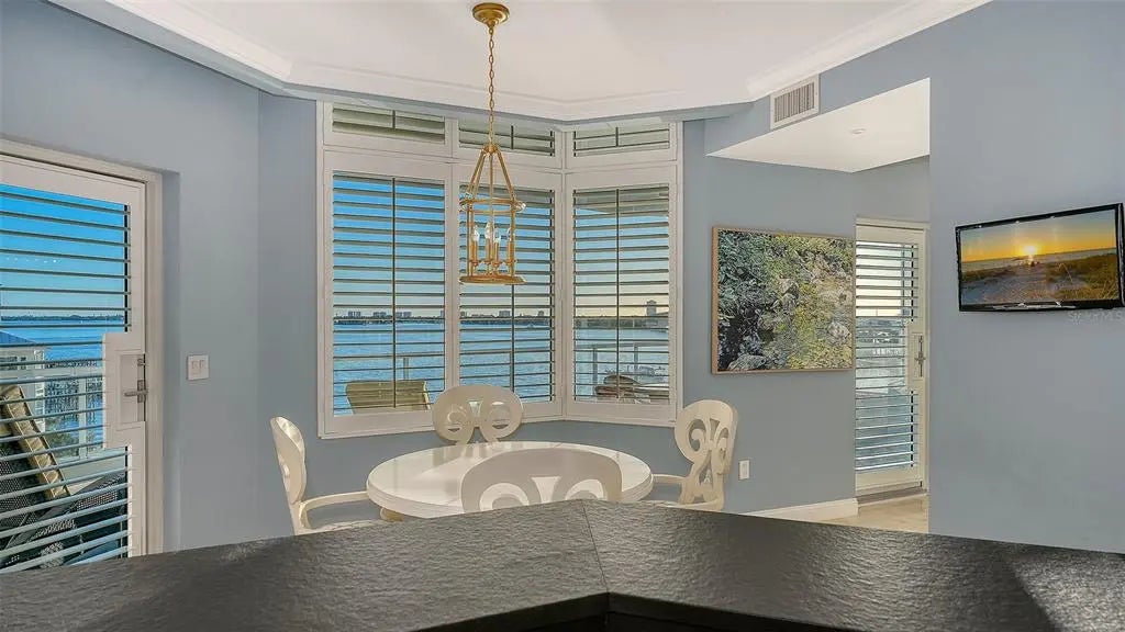 An exceptional waterfront offering at The Phoenix, one of Golden Gate Point’s most exclusive gated enclaves. Designed by renowned architect Brent Parker of BDG Architects, this boutique community features only 13 residences, with just two expansive homes per floor, providing remarkable privacy and sophistication. Residence 502 offers nearly 4,000 square feet under air in a distinctive circular floor plan, thoughtfully designed so every principal living space captures sweeping, unobstructed views of Sarasota Bay and the iconic John Ringling Causeway. Floor to ceiling hurricane rated glass fills the home with natural light and frames the ever-changing waterfront panorama. Two generous bayfront balconies provide stunning sunrise views, passing boats, and shimmering water vistas. A private elevator opens directly into the residence’s foyer. The expansive great room features 10-foot ceilings and a custom dry bar with ice maker and wine refrigerator, ideal for entertaining. The chef’s kitchen and breakfast room overlook the bay and main balcony and are equipped with textured cement countertops, a Dacor six burner gas range, double ovens with warming drawer, Sub Zero refrigerator and separate freezer, and reverse osmosis at the island bar sink. Additional highlights include a private two car garage, custom draperies and plantation shutters, and a residence designed to maximize privacy and panoramic water views throughout. Most furnishings are included, offering a seamless move in opportunity. Residents of The Phoenix enjoy a private waterfront pool overlooking a sandy beach and Sarasota Bay, a fitness center, and the security of a gated community, just moments from downtown Sarasota’s dining, shopping, marina, and cultural attractions.