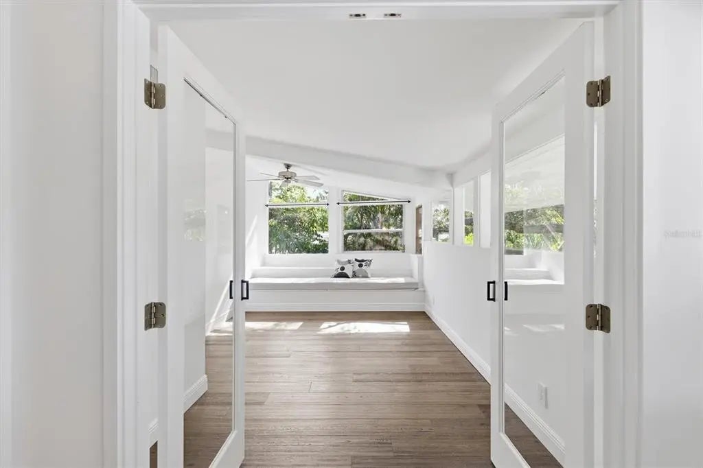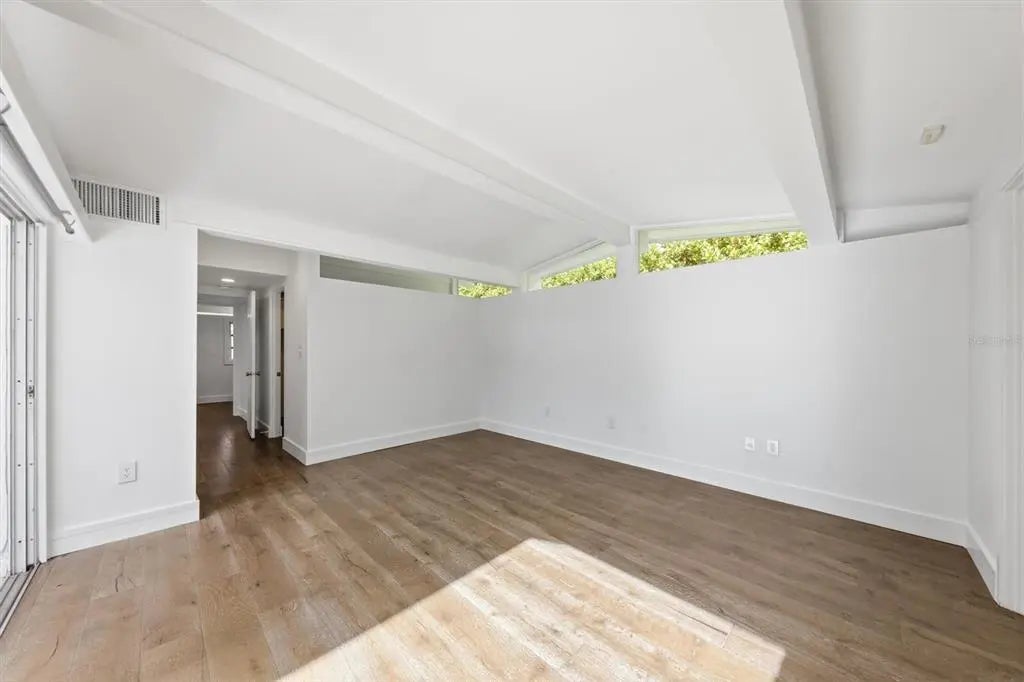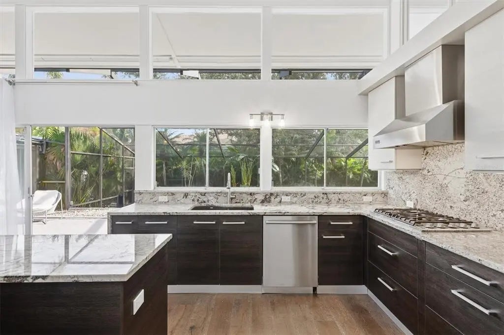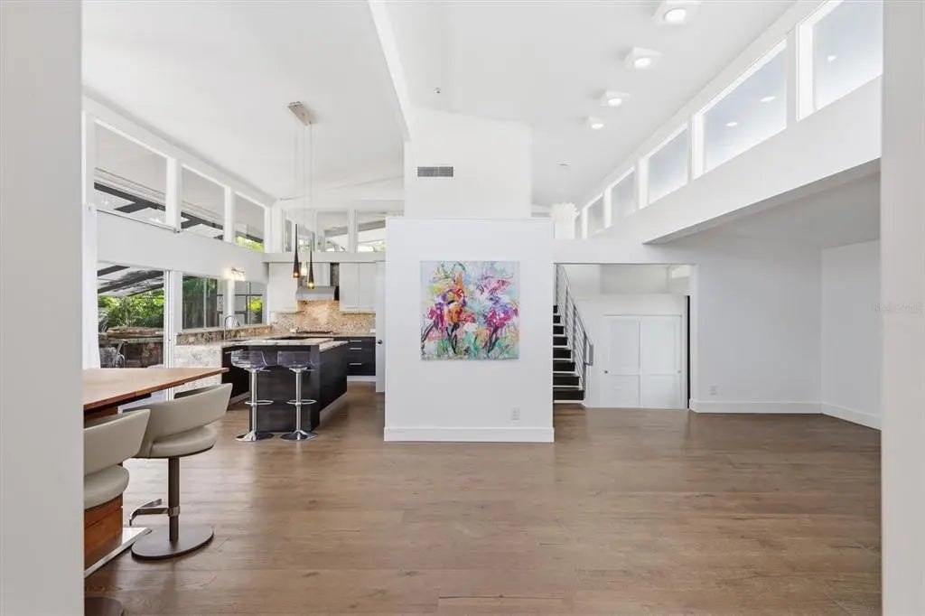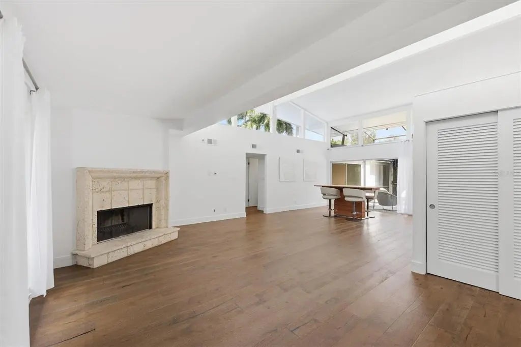 One or more photo(s) has been virtually staged. 425 Partridge Circle is a rare Mid-century Modern gem in the heart of Bird Key, originally designed in the 1960s by noted architect John M. Crowell. Set on a lush garden lot surrounded by mature tropical landscaping, this home blends iconic architectural features with thoughtful modern updates. The residence offers an open floor plan enhanced by expansive windows that invite in beautiful natural light and frame the vibrant tropical landscape and pool area. The striking coral-mantled woodburning/gas fireplace, high ceilings, stone countertops, Viking gas range with vent hood, and wine refrigerator all contribute to the home’s refined character. The two-story pool cage further elevates the setting, creating a dramatic sense of space and a completely private outdoor oasis. The main-floor primary suite features a spacious bathroom with a private outdoor shower, along with two closets—one a generous walk-in and the other a built-in wardrobe. Upstairs, a secluded guest suite offers ideal privacy and is complemented by a versatile flex room that can serve as an additional bedroom, office, or media room, along with its own full bath. Outdoors, the property transforms into a resort-like retreat with a heated saltwater pool designed by Lucas Lagoons, complete with a waterfall, spa, and grotto elements. The screened-in pool area includes an outdoor kitchen and shower, perfect for year-round enjoyment. The landscaping and irrigation system have been fully renewed, including a dedicated irrigation well. The Metal Roof was installed in 2024 and Pool Equipment replaced in 2023. Located just minutes from Lido Beach, St. Armands Circle, downtown Sarasota, and SRQ Airport, and within close proximity to the Bird Key Yacht Club, this home offers an exceptional combination of architectural pedigree, modern comfort, and an unparalleled island lifestyle. This is a rare opportunity to own a piece of Sarasota’s design history in one of its most sought-after neighborhoods.