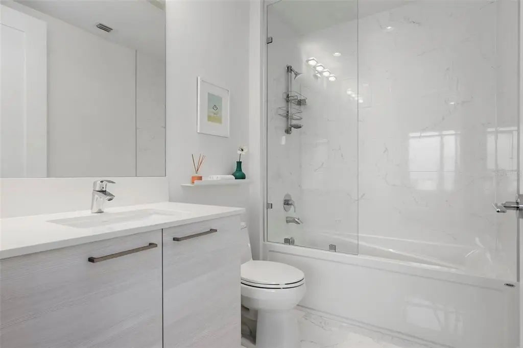 Exquisite, elegant, and serene living in the heart of splendid downtown Sarasota! Enjoy the morning on your balcony with your coffee in hand as you enjoy the bird’s eye views, and evenings relishing the Gulf breezes. This gorgeous condo is impeccable with European cabinetry, quartz countertops, custom woodworking, porcelain tiles, refreshing, subtle color palette, California Closets, and more! The open, expansive floor plan boasts natural light galore inspiring a cheery, light-hearted ambiance. The split bedroom layout allows for privacy and generous breathing space when entertaining guests. The primary bedroom is spacious and delightfully opens to the balcony for fresh air, complete with a thoughtfully designed walk-in closet, and a pristine en suite bathroom with dual vanities. The airy guest bedroom and en suite are perfect for hosting family and friends. There is a den for work or hobbies, and a powder room for guests. Spend afternoons by the glorious 65-foot infinity pool with peek-a-boo views of the Gulf! Enjoy all of the splendid, convenient amenities that The Mark offers to compliment your lifestyle: fire pit lounge, cabanas, outdoor grills, fitness center, spin room, clubroom with catering kitchen, pool table, café-style office space, 24-hour staffed reception, pet-friendly, security, an assigned parking space, and a separate secured storage unit. Saunter around downtown Sarasota, shop at the Saturday Farmers' Market, savor the authentic lemon tarts at C’est La Vie, attend the Sarasota Ballet or Orchestra, the lush gardens of Selby, and dozens of delightful restaurants and cafes! Enjoy sunny beach days at Lido Key and powdered sugar-soft beach walks. Evening strolls at the marina only a few blocks away, boutique shopping and street musicians at St. Armand’s Circle, or pop out for a last-minute cocktail at sunset with friends. The Mark is the epitome of downtown easy, breezy, luxury living! Swoop now before this gem is gone!