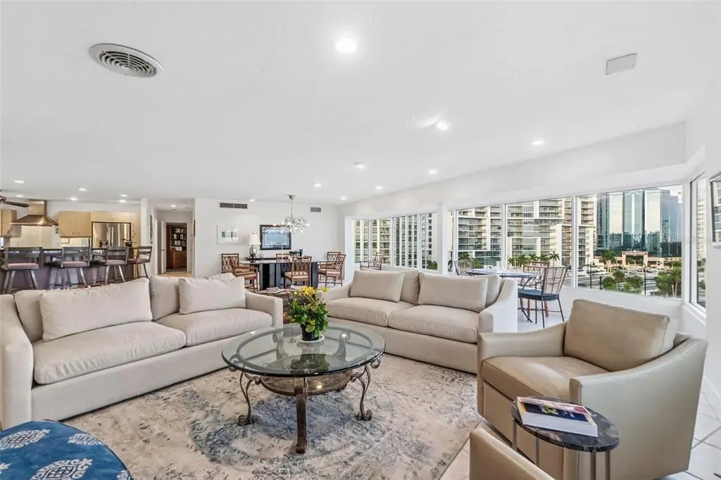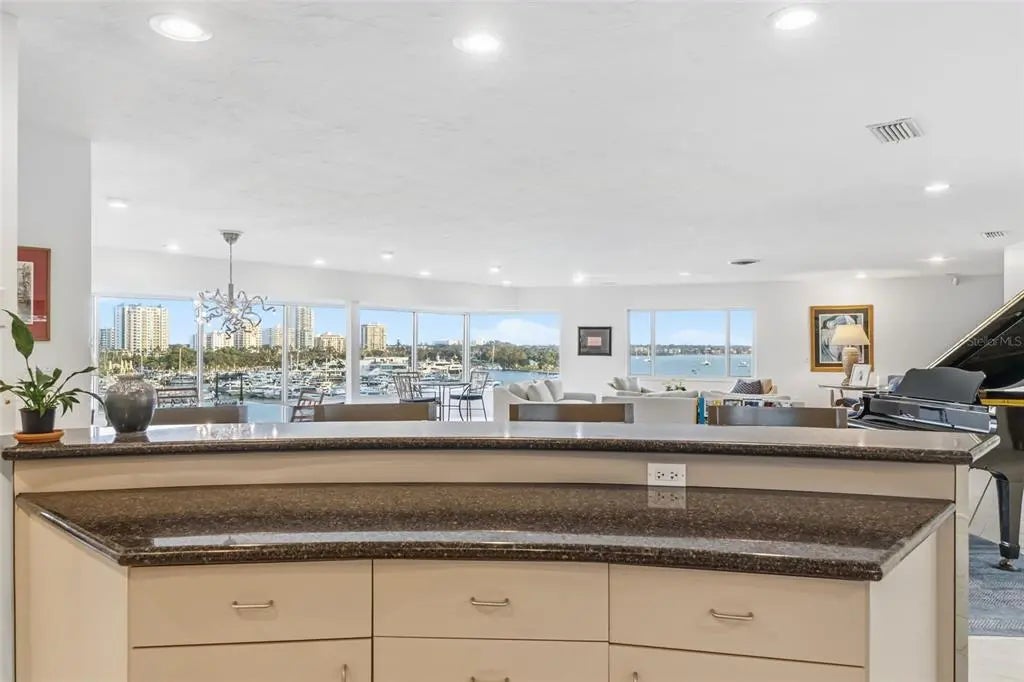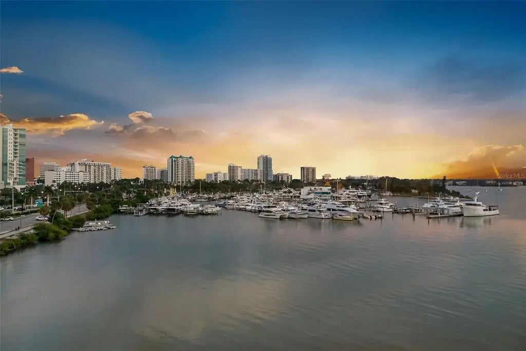 Set within a boutique building in Downtown Sarasota's Golden Gate Point, this remarkable waterfront penthouse offers a blend of privacy, sophistication, and coastal elegance. Featuring 3400 square feet, two reserved parking spaces, and a deeded boat slip for a 30-foot vessel, this is a rare gem. A private elevator delivers you directly to the residence, where an expansive, open-concept layout effortlessly connects the kitchen, living, and dining spaces ideal for hosting. Sweeping 180-degree unobstructed views span Marina Jack, Sarasota Bay, and the illuminated downtown skyline, creating a breathtaking setting that is both tranquil and vibrant. The primary suite is thoughtfully positioned apart from the guest rooms, offering a private retreat. Guests enjoy a beautifully appointed en-suite bedroom, while a flexible den provides the option of an additional bedroom or office. An in-unit laundry room and generous storage throughout ensures this 3,400-square-foot penthouse lives with the comfort and ease of a private home. The building features recent upgrades including a new roof and a beautifully updated common area on the 2nd floor with new glass enclosures. Just moments from the John Ringling Bridge, Marina Jack, the Downtown Farmers Market, celebrated dining, and the Sarasota Yacht Club, this penthouse captures the very essence of refined waterfront living in one of Sarasota's most desirable location.