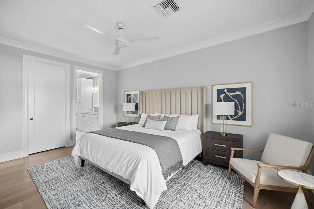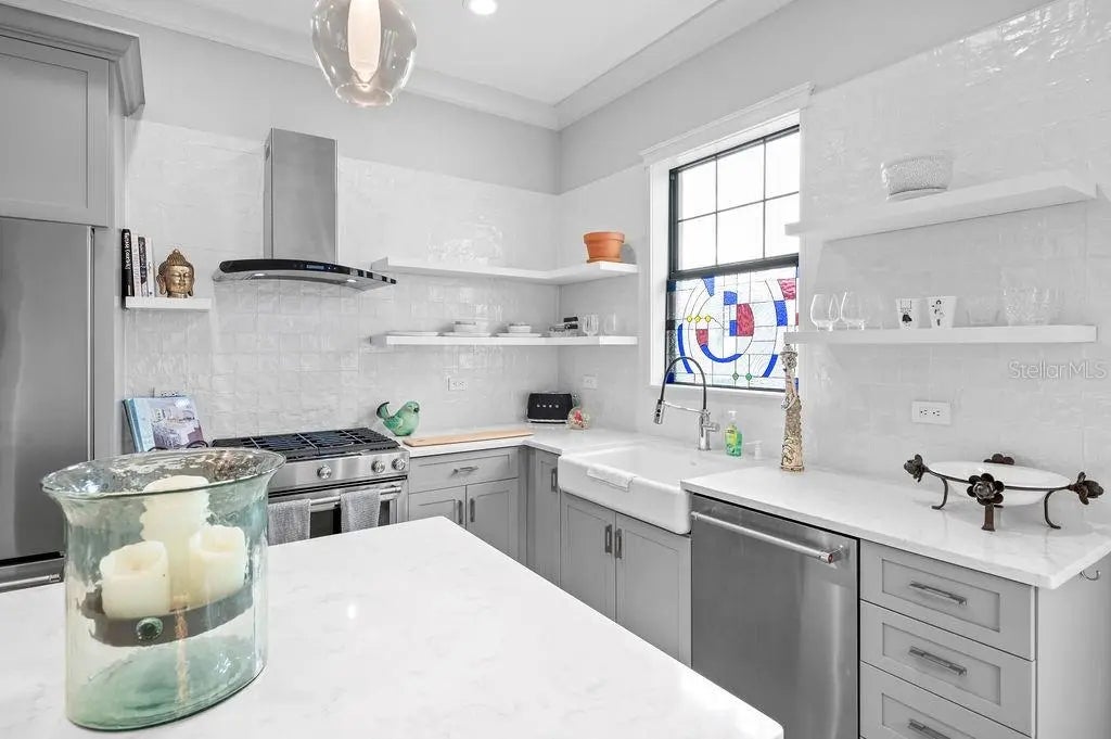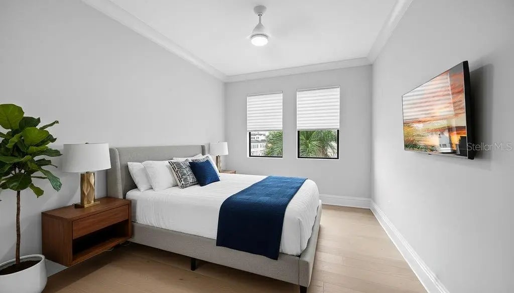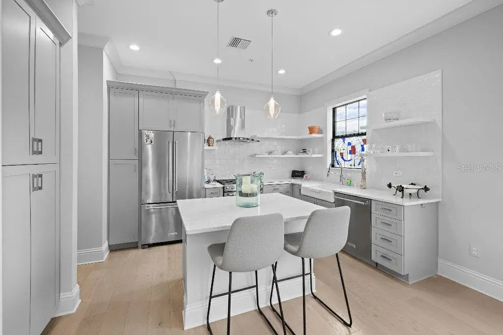 One or more photo(s) has been virtually staged. Perfectly positioned in the heart of downtown Sarasota, this refined three-story residence in the coveted enclave of Valencia Rosemary Place embodies the essence of modern luxury living. Tucked along a quiet private lane with tranquil park views, the home offers 2,291 square feet of impeccably curated interiors, including three private bedroom suites, 3.5 baths, and a luminous main living level designed for effortless everyday living and sophisticated entertaining. A charming terrace off the primary suite adds a serene outdoor escape. Every detail has been elevated with thoughtful intention. Rich hardwood flooring, soaring ceilings, crown molding, premium plaster-finished walls, and designer lighting create a warm, contemporary elegance throughout. The reimagined chef’s kitchen serves as the home’s centerpiece—an artful blend of style and function—featuring quartz surfaces, solid wood cabinetry, Moroccan tile accents, open shelving, KitchenAid appliances, a gas range, and an inviting island with expanded pantry storage. The primary suite offers a peaceful retreat with its own private terrace, while two additional guest suites provide exceptional comfort and privacy for family or visitors. A two-car garage, generous storage on every level, and low-maintenance living further enhance the home’s appeal for both full-time and seasonal residents. All of this is just minutes from Sarasota’s celebrated dining, boutique shopping, performing arts venues, and The Bay waterfront—creating a rare opportunity to enjoy refined, lock-and-leave living in one of the city’s most vibrant and walkable neighborhoods.