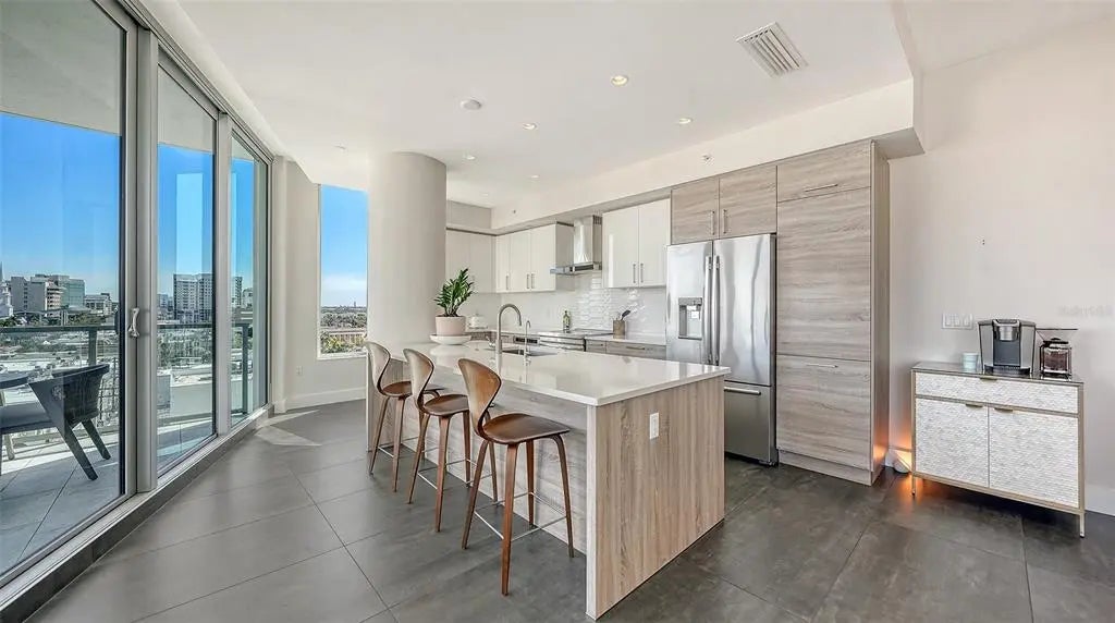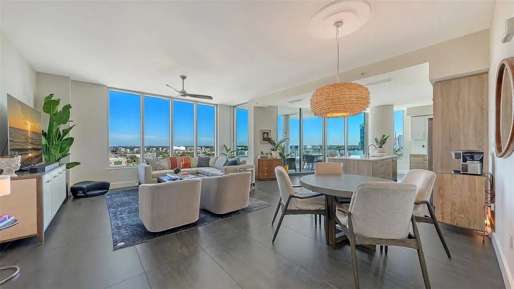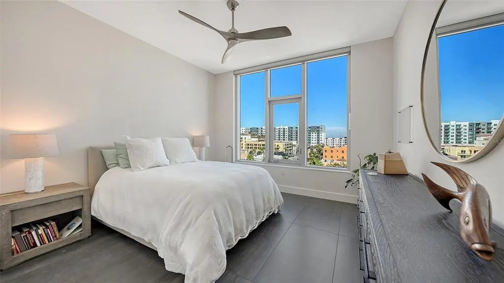 Welcome to The Mark, a contemporary residence in the heart of downtown Sarasota. This sixth-floor corner condominium spans 2,112 square feet of interior living space with an additional 170-square-foot terrace offering panoramic city views. The open-concept floor plan integrates the kitchen, dining and living areas, all framed by 10-foot ceilings, motorized shades, ceiling fans and custom porcelain tile flooring. The kitchen features an induction cooktop with hood, convection oven, microwave, tiled backsplash, RO drinking water system, French door refrigerator with ice and water dispenser, and a large island for entertaining. Each of the three bedrooms includes a private en-suite bath, with primary suite offering two closets (including a walk-in), a ceiling fan and a spa-inspired bath with dual vanities and a multi-head walk-in shower. A powder room, dedicated laundry room with full-size appliances and cabinetry, and a den designed for work or leisure complete the interior. This 2019-built residence includes Cat-5 impact windows, Cat-5 ethernet wiring throughout and a secured storage space on the same floor. One reserved parking space is on the third level of the secured garage. The building is outside a designated flood zone. Amenities at The Mark include a 60-foot resort-style pool with infinity edge, swim lane and full-length bench seating, a spa, two gas grills, gas firepit with lounge seating, fitness center with a spin/Pilates room, a clubroom with full bar, large TVs and pool table, a business center and conference room for resident use. Residents benefit from 24/7/365 front desk staff, secured lobby access and overnight roving security. Enjoy immediate access to Sarasota’s renowned restaurants, shopping, arts venues and the harbor. The Mark, where downtown is downstairs. Showings begin March 28, 2026, meanwhile, please refer to the virtual tour link.