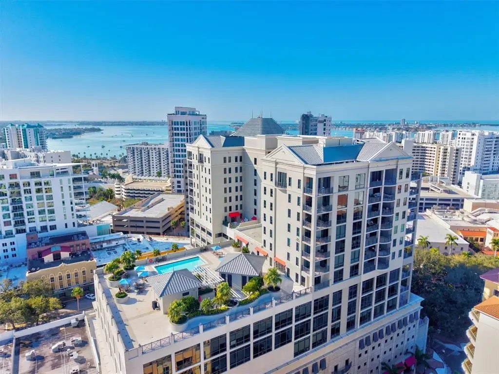 Residence 15A at Plaza Five Points offers a rare opportunity to live at the heart of downtown Sarasota while enjoying the calm, privacy, and personal service of a boutique luxury building. Plan to visit; it’s located in the city’s historic Five Points—long recognized as the cultural and social crossroads of downtown—so this address places parks, the bayfront, theaters, restaurants, farmers markets, and signature Sarasota events just steps from your door. This 15th-floor, well-cared-for residence, approximately 1,595 square feet, includes two bedrooms, two bathrooms, and a well-appointed kitchen with European-style wood cabinetry that delivers a clean, warm, modern look, paired with consistent, full-height cabinet runs that signal storage, symmetry, and design discipline. An efficient open layout and higher elevated city views. The floor plan balances interior openness with privacy; see the plan in the photo array and schedule a visit to view it. This offering is ideal for full-time living or a refined lock-and-leave retreat. Secure parking and dedicated storage enhance day-to-day convenience. Plaza Five Points is intentionally uniquely different. With only 49 residences, the building offers a quiet, uncrowded atmosphere rarely found in downtown high-rises. Residents frequently note the sense of calm, privacy, and personal space while still enjoying an active, welcoming community. An added upside is that the building is self-managed, with long-tenured on-site leadership and staff who know the property intimately, resulting in consistent care, cleanliness, and service you'd expect. Amenities are designed for real living: a heated pool with full-sun exposure, a spa, a beautifully updated clubroom overlooking the pool, a guest suite for your visitors, concierge services, secure package handling, and a newer, well-equipped fitness center. Optional social engagement includes organized gatherings and group outings, while still preserving a respectful, low-key environment. Built in 2005 to modern hurricane standards, Plaza Five Points has long been admired for its construction quality, intimate scale, and enduring appeal. Market appeal reinforces the long-term value of residences at this address—particularly when offered in alignment with market expectations. A rare downtown Sarasota offering where location, culture, privacy, and warmth come together—Residence 15A delivers not just a home, but a lifestyle rooted in connection, walkability, and quiet sophistication. Schedule a private showing today.