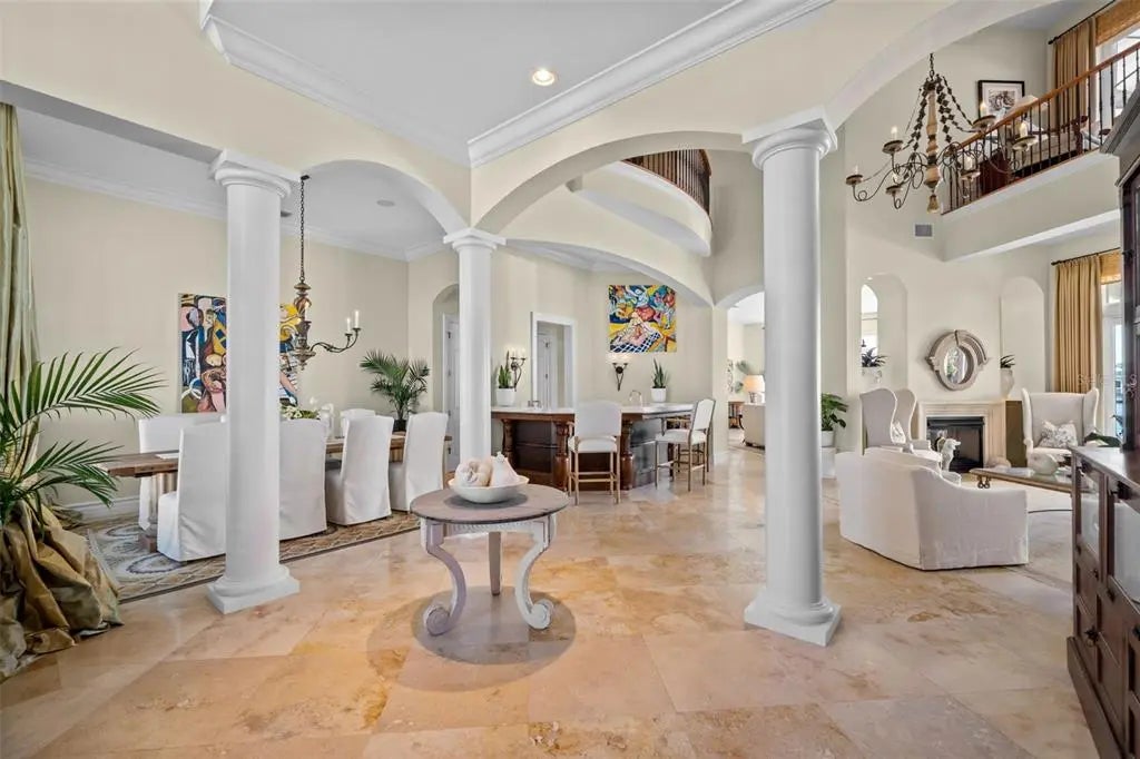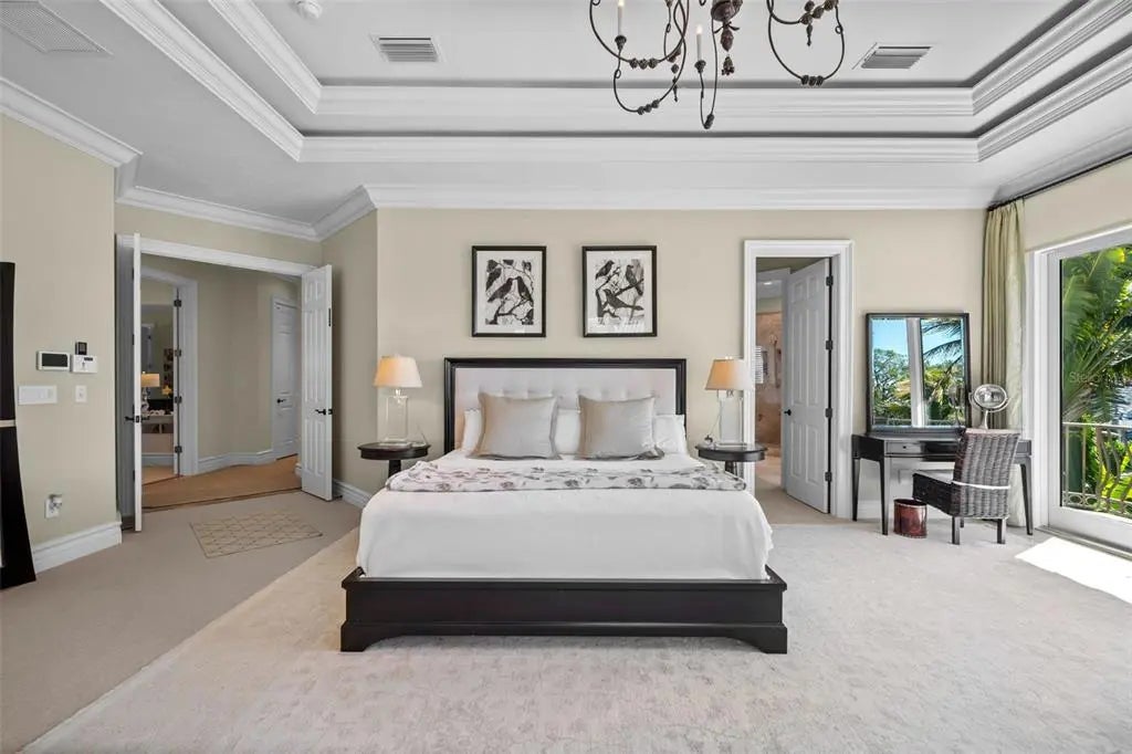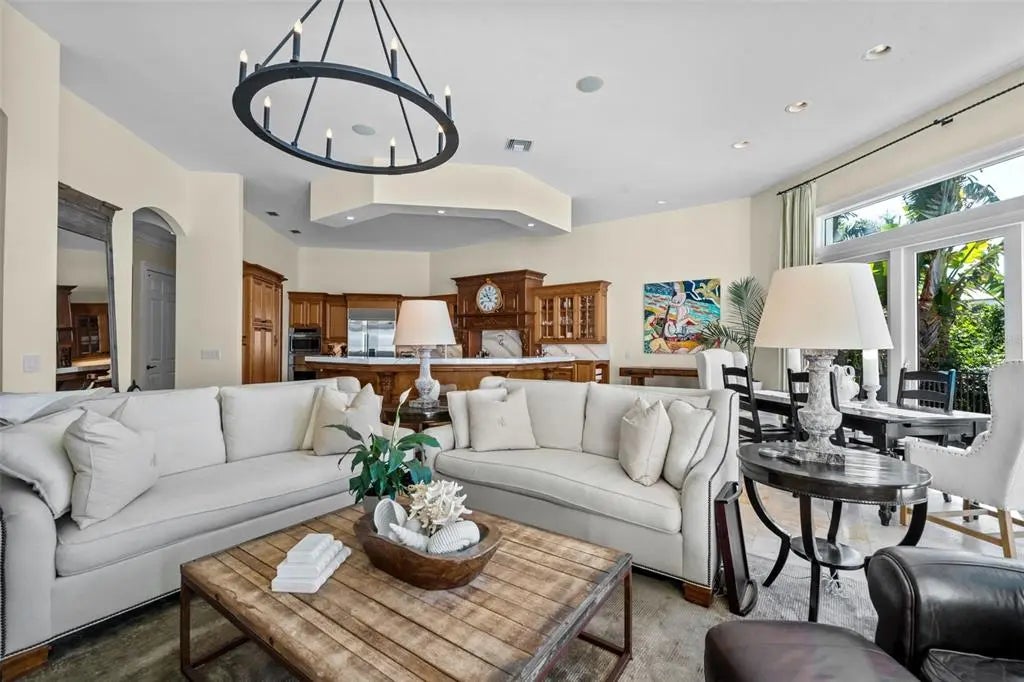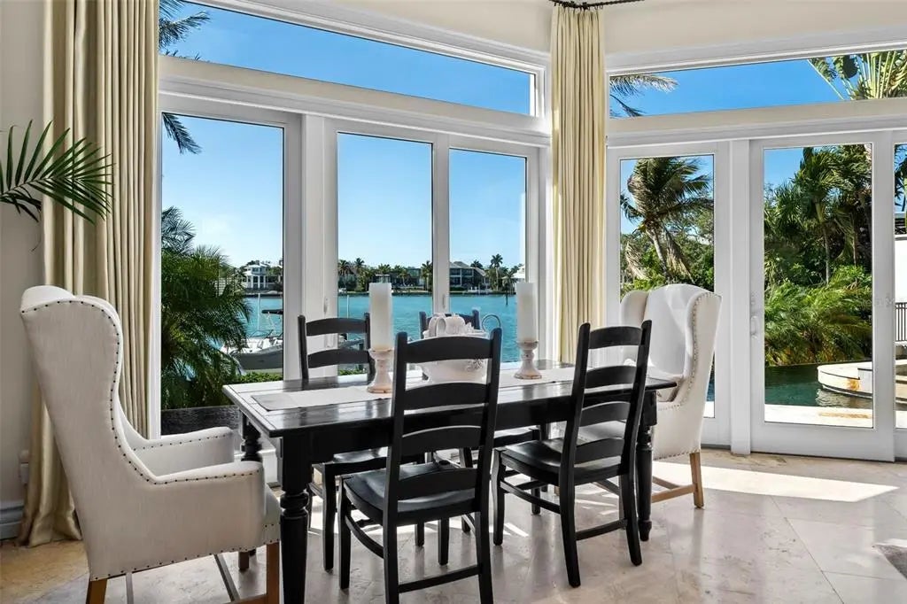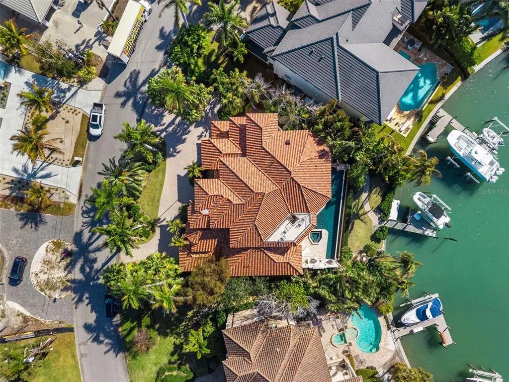 Presenting a distinguished waterfront estate located in Sarasota’s premier bayfront community, Harbor Acres, widely regarded as the city’s most coveted neighborhood. Perfectly situated on a protected deep-water boat basin, this property offers immediate access to Sarasota Bay with the added benefit of a boat dock and lift on calm waters-ideal for larger vessels. With prized southern rear exposure, the home is bathed in natural light throughout the day, while capturing glowing sunsets across the water — a rare and highly desirable feature for waterfront living. The thoughtfully designed 4-bedroom, 6 bath floor plan offers exceptional flexibility and privacy, with distinct guest wings that function almost as private suites — ideal for hosting extended family, visiting friends, or even live-in arrangements without sacrificing personal space. The seamless flow between formal and casual living areas makes the home equally suited for elegant entertaining or relaxed everyday living. At the heart of the home, the chef’s kitchen features beautiful quartz countertops, island, abundant cabinetry, and premium appliances, opening effortlessly to the family room and outdoor living areas. A striking double-sided gas fireplace creates ambiance between key gathering spaces, enhancing both intimate evenings and larger gatherings. Enjoy the rare luxury of choosing between two primary suites. Both primary suites are serene retreats offering generous proportions, tranquil water views, and a spacious walk-in closets with custom built-ins designed for optimal organization. The spa-inspired baths provides a luxurious escape at the end of the day. Outdoor living is where this property truly shines. A fully equipped summer kitchen anchors the covered lanai, creating the perfect setting for waterfront dining and entertaining. The infinity edge pool, spa and outdoor lounge areas overlook the wide boat basin, where you can watch dolphins pass and boats glide by — all from the comfort of your own backyard.