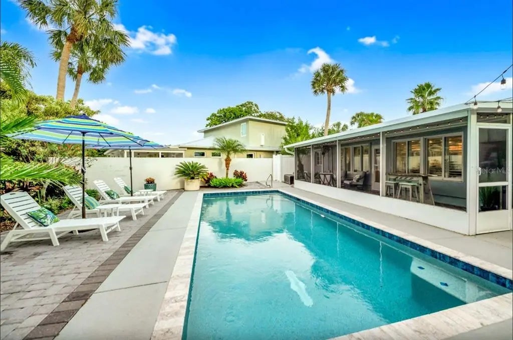 Welcome to your private coastal sanctuary just moments from the powder-soft sands of Lido Beach and a short stroll to iconic St. Armands Circle. Perfectly positioned in one of Sarasota’s most coveted island neighborhoods, this stunning residence captures everything buyers dream about when they imagine luxury living by the sea. From the moment you arrive, lush tropical landscaping and swaying palms frame a beautifully maintained property that feels both secluded and inviting. The expansive paver drive and manicured lawn create a grand first impression, while mature greenery provides privacy rarely found this close to the beach. Inside, the home blends refined elegance with relaxed island charm. Sunlight pours through plantation-shuttered windows, illuminating spacious bedrooms designed for comfort and style. The primary suite is a tranquil retreat with soft coastal tones and garden views, while the guest rooms are thoughtfully appointed to accommodate family and visitors with ease. Every space feels bright, airy, and curated for effortless living. The bathrooms are nothing short of spa-worthy. Floor-to-ceiling marble tile, frameless glass showers, custom vanities with stone countertops, dual sinks, and elegant fixtures create a luxurious experience that rivals high-end resorts. Thoughtful details like recessed niches, designer mirrors, and soft lighting elevate each space. Step outside and the property truly comes to life. The private backyard oasis is designed for unforgettable gatherings and serene relaxation alike. A sparkling pool is surrounded by expansive decking, lounge seating, and tropical landscaping that transforms the space into your own secluded resort. String lights overhead add ambiance for evening swims, while shaded seating areas invite long afternoons under the palms. The fully fenced yard enhances privacy, creating a rare sense of retreat just minutes from everything. And the location — simply exceptional. Imagine morning walks to Lido Beach, sunset cocktails at St. Armands Circle, boutique shopping, award-winning dining, boating, and downtown Sarasota’s vibrant arts scene all just moments from your front door. Homes in this location with this level of finish and established rental success are incredibly rare. Whether you are searching for a luxury island residence, a sophisticated vacation retreat, or a high-performing investment property with proven appeal, this home delivers on every level. Offered in pristine condition and designed for both comfort and entertaining, it embodies the very best of coastal Florida living. This is more than a home. It is the St. Armands lifestyle — elevated, private, and unforgettable.