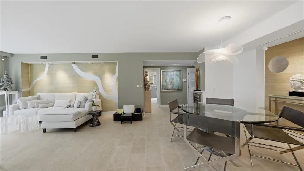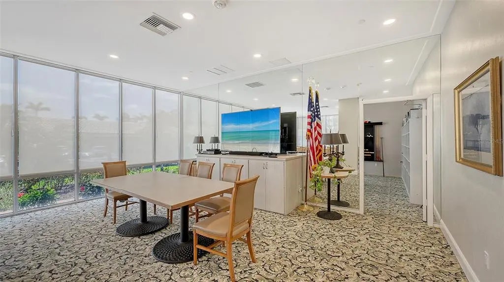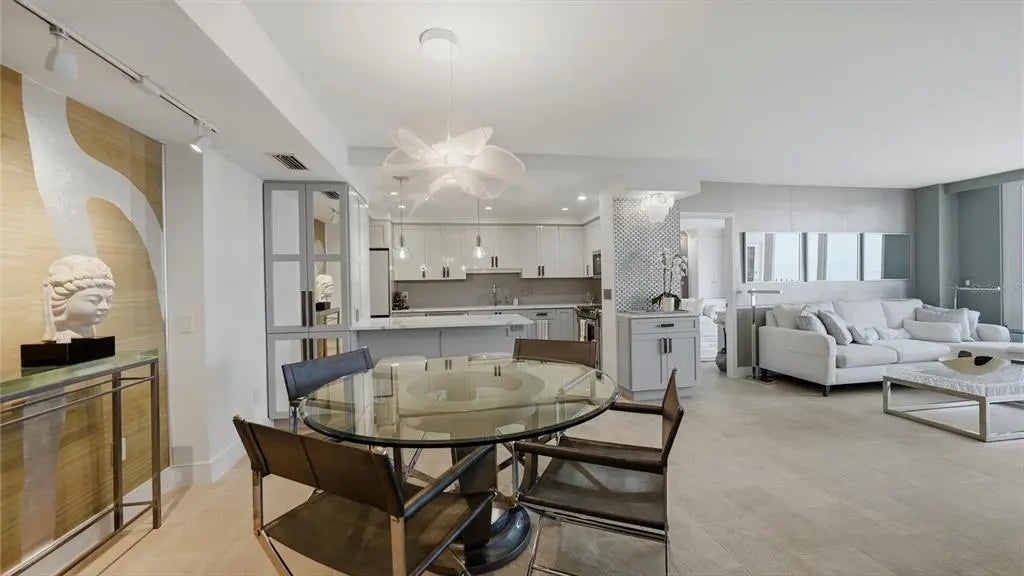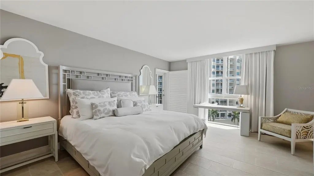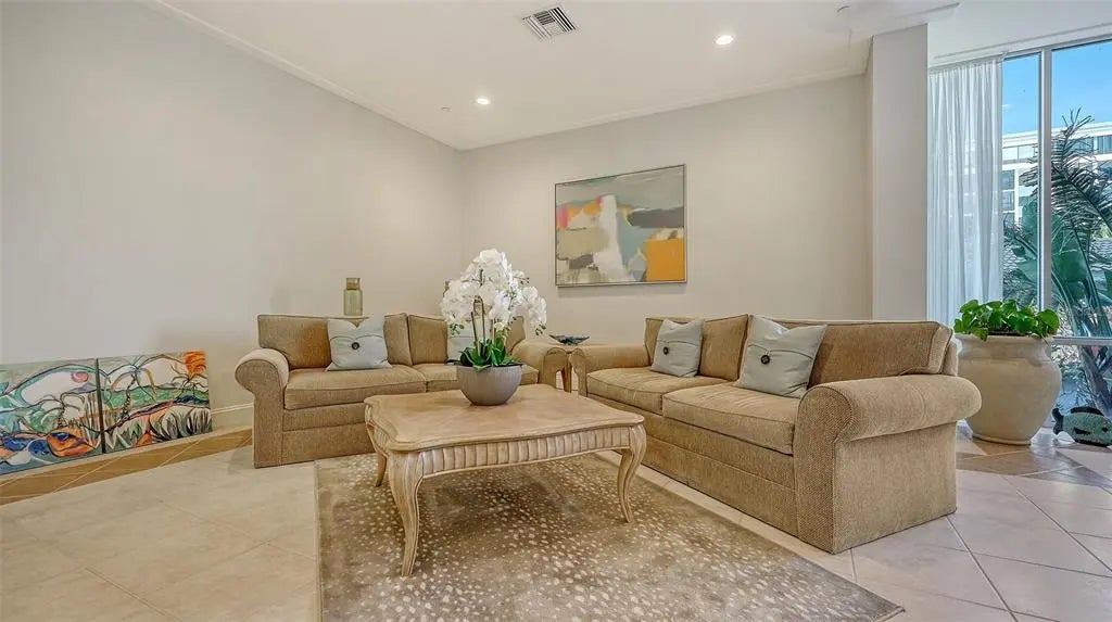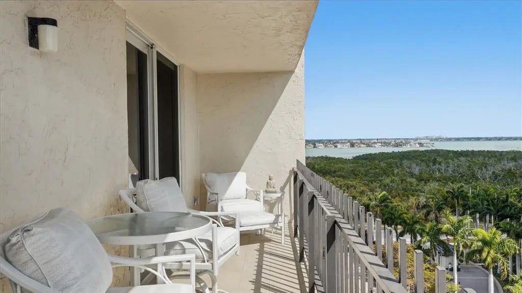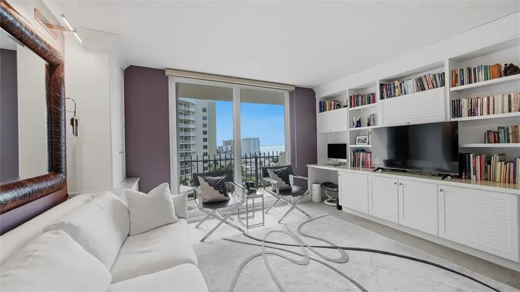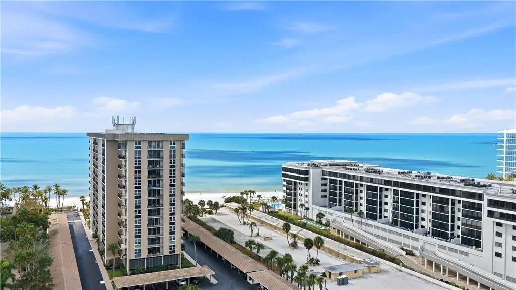 Positioned on the ninth floor of Lido Beach Club, this fully renovated Gulf-to-bay residence captures breathtaking views from nearly every room. Located at 1212 Benjamin Franklin Drive, this two-bedroom, two-bath residence offers 1,400+ square feet of interior space and an open layout designed to maximize light, sightlines, and indoor-outdoor living. From the moment you enter, the reimagined floor plan creates a seamless flow between the living, dining, and kitchen areas. Expanses of impact-rated windows and sliding glass doors frame panoramic vistas of the Gulf of Mexico, Sarasota Bay, and the city skyline beyond. Tile flooring runs throughout, reinforcing the clean, coastal aesthetic and low-maintenance appeal. The updated kitchen is thoughtfully designed with quartz countertops, solid wood custom cabinetry, stainless-steel appliances, breakfast bar seating, tile backsplash, and a wine refrigerator. Pendant lighting and sleek finishes elevate the space while maintaining functionality for everyday living and entertaining. The living room opens directly to the elongated terrace, where east-facing exposure delivers beautiful morning light and dual water views. Both bedrooms also feature terrace access, extending the living space outdoors and offering private vantage points to enjoy sunrise skies and shimmering Gulf waters. The primary suite is positioned on the north side for privacy and features a walk-in closet and a renovated bath with marble counters, updated vanity, and a glass-enclosed shower. The south-side guest bedroom, currently arranged as a den with custom built-ins and a planning desk, includes sliding glass door access to the terrace and an updated bath (2023). The split-bedroom configuration enhances privacy for residents and guests alike. Additional highlights include impact glass throughout, built-in features, high ceilings, central air (replaced in 2020), newer water heater (2020), and covered assigned parking. Lido Beach Club offers a secure, beachfront lifestyle with a private lobby entrance and direct access to Gulf shores. Each residence includes a private storage locker located on the unit floor, additional exterior storage space, and access to a convenient community laundry room on every level. The pavered pool deck surrounds a heated swimming pool and provides an inviting setting for relaxing or gathering with friends. Residents enjoy two grilling stations and a beachside fire pit area with seating—ideal for sunset evenings along the Gulf. Recreational amenities include a pickleball court, a game room with ping pong and billiards, a well-equipped fitness center, library, club room with catering kitchen, social room, and a dedicated meeting room for community events. Located minutes from St. Armands Circle, residents enjoy world-class shopping, waterfront dining, and vibrant cafés. Downtown Sarasota is just over the bridge, offering the Sarasota Opera House, Florida Studio Theater, Selby Gardens, Marina Jack, and The Bay Park. Whether enjoying morning walks along the sand, boating on Sarasota Bay, or evenings in the city, this ninth-floor Lido Beach residence delivers exceptional coastal living with expansive water views and move-in ready comfort.