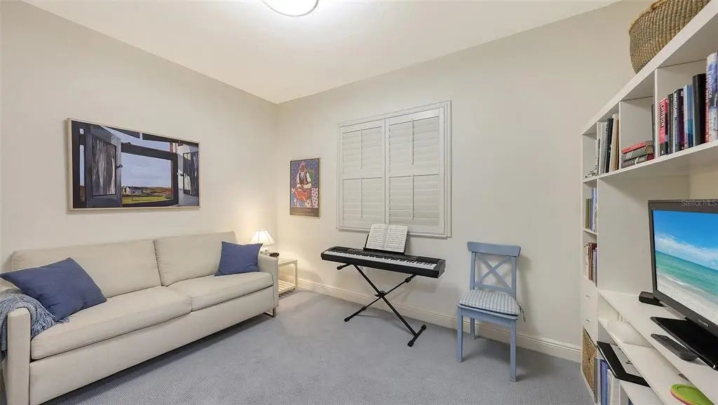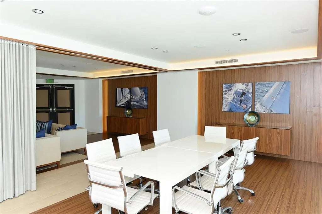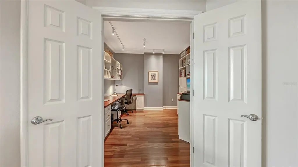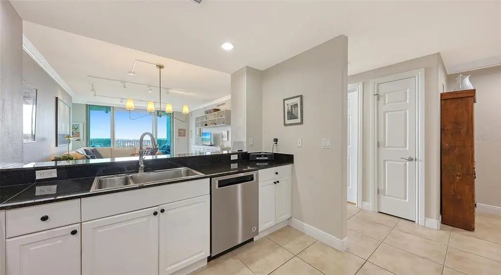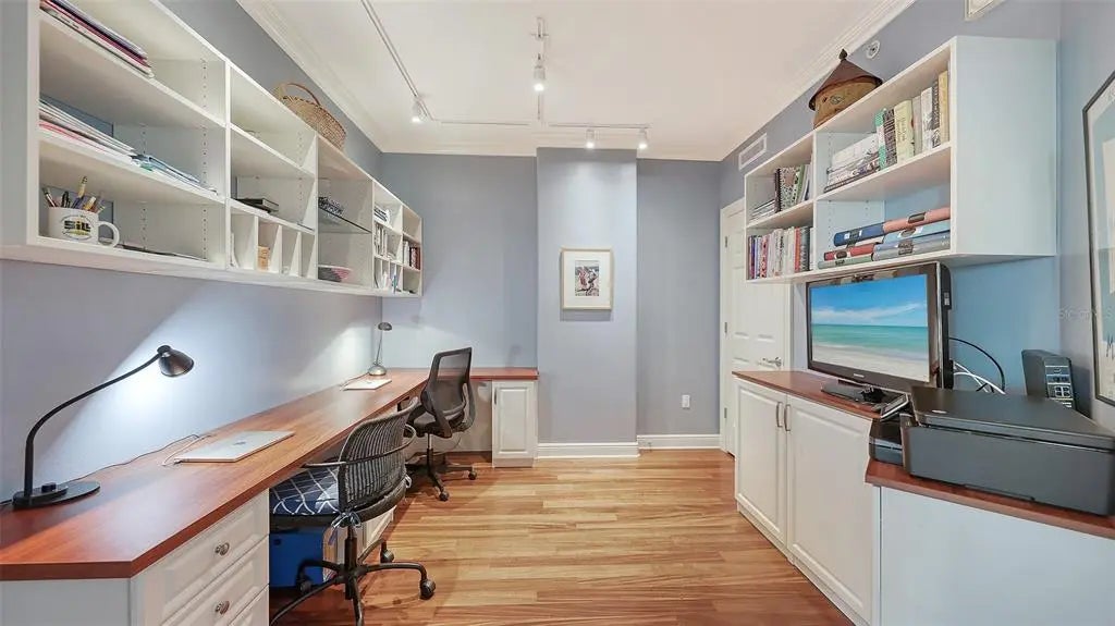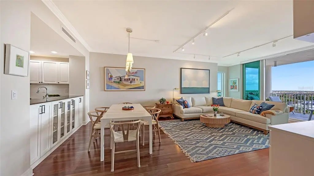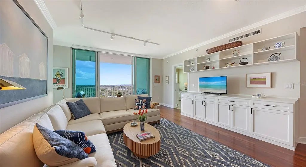 Welcome to 1771 Ringling Blvd #1008 at Rivo at Ringling — a 2BR, 2BA + Home Office residence offering 1,442 sq ft of open-concept living in the heart of downtown Sarasota. Southern exposure fills the space with natural light, creating a warm, inviting atmosphere. The living room and primary suite both enjoy views of Sarasota Bay and the city skyline. The open layout flows seamlessly to a private terrace — ideal for morning coffee or evening relaxation. The updated kitchen features granite countertops, refreshed cabinetry, upgraded SS appliances, and an induction range for precision cooking and energy efficiency. The primary suite includes custom closets and a renovated en-suite bath. A guest bedroom offers privacy for visitors. The residence also features a dedicated home office with custom built-in dual desks, shelving, and cabinetry. Recent improvements include 2022 Trane A/C, 2022 Rheem water heater, designer lighting, plantation shutters with blackout shades, illuminated built-ins, and new guest bedroom carpeting. Rivo amenities include secure parking, owner storage, bike and kayak storage, fitness center, pool, and social room. Enjoy true walkability to restaurants, theaters, shops, waterfront parks, and Sarasota’s vibrant cultural district. Walk to dinner. Walk to the waterfront. Walk to the arts. Come home to warmth, light, and bay views that elevate everyday living.
