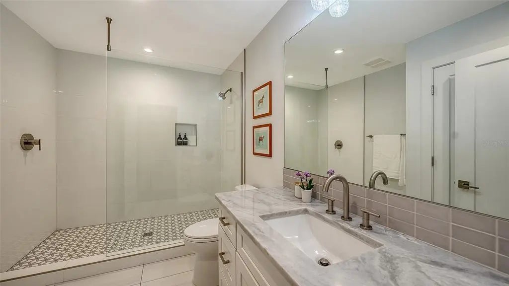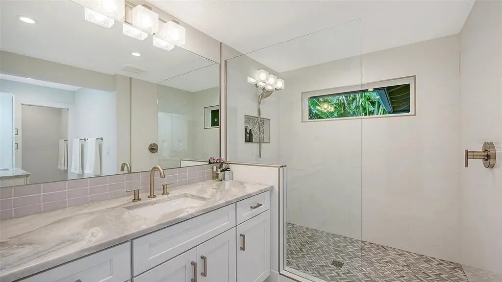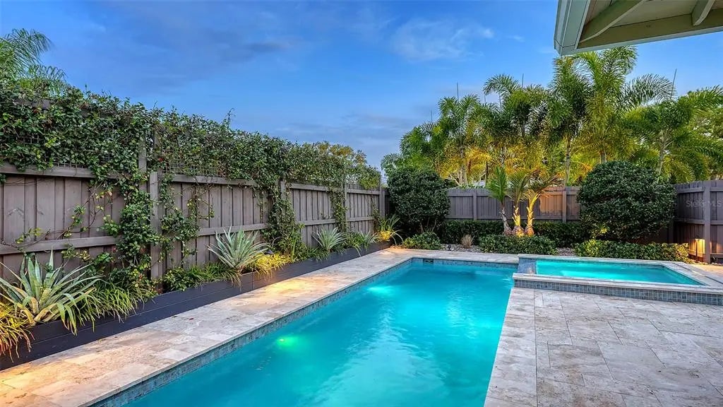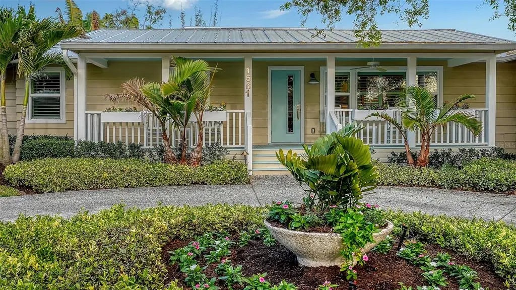 Live where mornings begin with coffee on the wide front porch beneath mature live oaks and evenings end with a swim in your own heated pool and spa, added by the current owner to elevate Florida living. Completely renovated down to the studs in 2021, this move-in-ready, three-bedroom, three-bath Arlington Park pool home with dedicated office, den/sunroom and bonus room blends timeless mid-century charm with modern systems and design. Major upgrades include a 2021 metal roof, newer plumbing, newer electrical wiring and panel, hurricane-rated windows, hurricane-rated garage door, LED lighting and hand-scraped engineered hardwood floors throughout, delivering both beauty and long-term peace of mind. Walls were thoughtfully opened to create bright, flowing living spaces anchored by a stunning Quartzite kitchen featuring an oversized island with seating, solid wood soft-close cabinetry, stainless KitchenAid appliances including under-counter microwave, full-height subway tile backsplash, ample pantry storage, and a built-in Quartzite-topped buffet with glass-front cabinetry and wine refrigerator in the dining area. The spacious living room and adjoining den/sunroom connect seamlessly to the private, fully fenced backyard oasis with multiple seating areas and professional landscaping. The owner’s suite offers a peaceful retreat with spa-style bath, Quartzite counters, glass-enclosed shower and private outdoor lounging deck, while two generously sized guest bedrooms, one ensuite, and two additional fully reimagined baths provide comfort and flexibility. A custom office with Quartzite and wood built-ins supports work-from-home ease, and the large bonus room is ideal for a gym, media room, or play space. Perfectly positioned on a prominent corner lot with circular driveway and side-entry two-car garage, this home is a short distance from Arlington Park and Aquatic Complex featuring a 50-meter lap pool, fitness center, indoor gymnasium, tennis and pickleball courts, basketball courts, playground, dog park and scenic walking trails, and is minutes to Downtown Sarasota’s restaurants, arts and waterfront, Southside Village shopping and dining, Sarasota Memorial Hospital and the world-famous beaches of Siesta Key. For buyers searching for a fully renovated Arlington Park pool home in Sarasota with modern upgrades, walkability and unbeatable proximity to parks, downtown and beaches, look no further.
