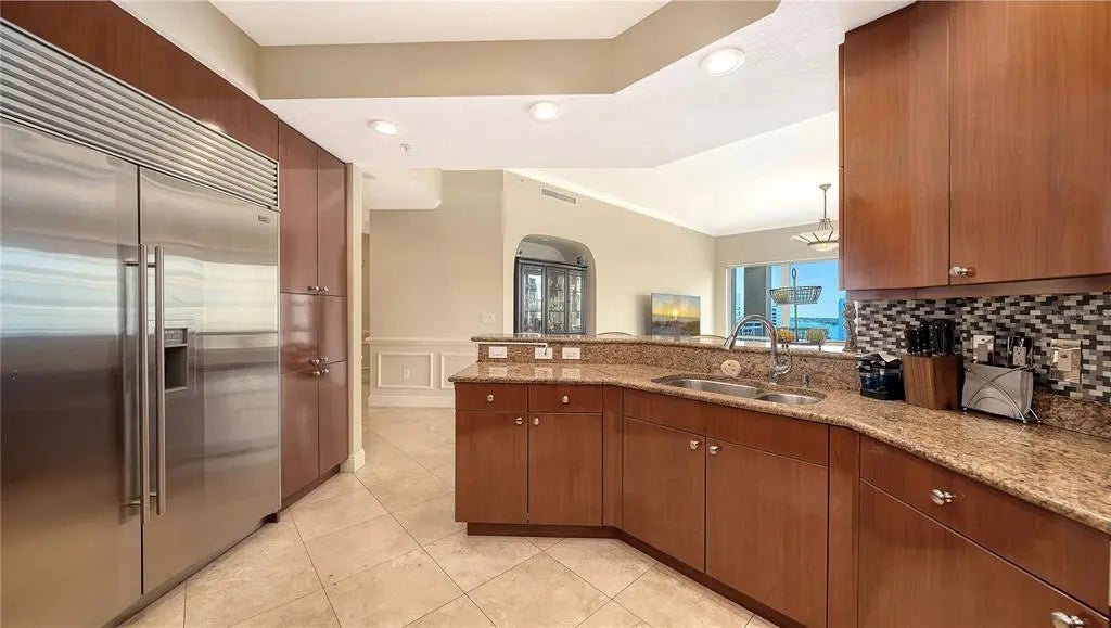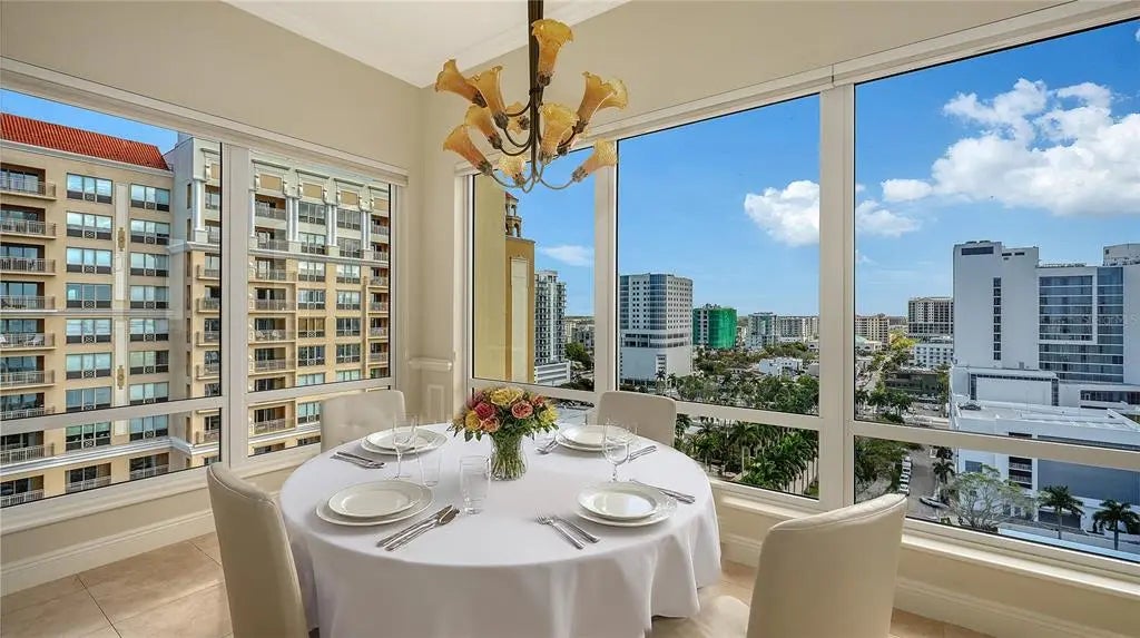 Perfectly placed on the 15th floor of the Ritz-Carlton managed Tower Residences, this corner residence captures sweeping panoramas of Sarasota Bay, the Bayfront yacht basin, the downtown skyline, and vibrant city lights stretching toward the horizon. Spanning nearly 2,800 square feet, the open floor plan is designed to frame water and city views from nearly every room while offering comfortable spaces for both everyday living and entertaining. Travertine flooring flows throughout the main living areas, creating a cohesive foundation for the light-filled interior. The great room is surrounded by walls of floor-to-ceiling windows and glass sliders that open to the residence’s largest terrace, creating a seamless indoor-outdoor connection and an ideal setting for taking in Sarasota’s skyline and waterfront activity. Just beyond, the dining area is positioned to capture sweeping views while remaining conveniently connected to the kitchen. The chef’s kitchen blends functionality with timeless design, featuring natural wood cabinetry, granite countertops, stainless steel appliances, and a breakfast bar that opens to the living areas. This thoughtful layout encourages effortless entertaining while maintaining clear sightlines to the water and city skyline. All bedrooms feature bamboo hardwood flooring, offering warmth and contrast to the stone flooring in the main living spaces. The primary suite is privately positioned and serves as a relaxing retreat, complete with direct terrace access, dual walk-in closets, and a spacious marble en-suite bath with split vanities, soaking tub, and separate shower. The guest suite includes its own walk-in closet and a private terrace, while the third bedroom—currently arranged as a den or office—provides flexibility for guests or remote work. The residence includes two secure under-building parking spaces and an air-conditioned owner’s storage unit located on the third floor. Life at The Tower Residences offers the full benefit of Ritz-Carlton services and amenities. Residents enjoy concierge assistance, valet parking, and 24-hour room service from the adjacent Ritz-Carlton Hotel. Community features include a resort-style pool and spa (currently being updated), outdoor grilling and dining areas, an expansive social room with catering kitchen and fireplace, a theater, billiards and recreation room, elegant library and boardroom, and a fully equipped fitness center with locker rooms, sauna, steam room, and massage facilities. Located in the heart of downtown Sarasota, this residence places the city’s waterfront lifestyle just outside your door. Marina facilities are less than half a mile away, while nearby Bayfront Park, the Sarasota Opera House, Van Wezel Performing Arts Hall, and numerous galleries and theaters anchor the city’s vibrant cultural scene. St. Armands Circle’s boutiques and restaurants are less than two miles away, and the white sands of Lido Key and Longboat Key’s Gulf beaches are only minutes from the property—bringing the very best of Sarasota living within effortless reach.