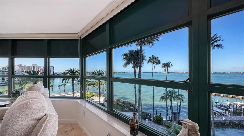 EXPERIENCE REMARKABLE DOWNTOWN SARASOTA LIVING AT IT'S BEST! Spectacular unobstructed views of the Gulf and Sarasota Bay from every room in this spacious 2 bedroom 2 bath, 6th floor condo. Light and bright with an open floor plan which is great for entertaining and a balcony to enjoy the beautiful blue skies, water and colorful sunsets. The kitchen has wood cabinets, granite counters, stainless appliances and great views The primary bedroom has a walk in closet and private balcony where you can enjoy morning coffee. The ensuite bath has dual sinks, lots of storage and a walk in shower. The guest bedroom is a generous size and there is a second full bath with tub and shower. Separate storage area on the 1st floor and community mail area. Concierge Service, Parking garage, EV station, Security Gatehouse 24 hours & Night Security. Enjoy the resort style pools, tennis courts, pickleball courts, newly refinished fitness center, sauna and private marina with boat slips. There is a social club room and library. This location is fabulous, very close to the Van Wetzel live theater as well as other theaters and the Sarasota Orchestra. There is a variety of fine dining restaurants for everyone, festivals and wonderful music and a farmers market. A short walk to Bay Front Park or a short drive to St. Armands circle with upscale shops, restaurants and beautiful Lido Beach.