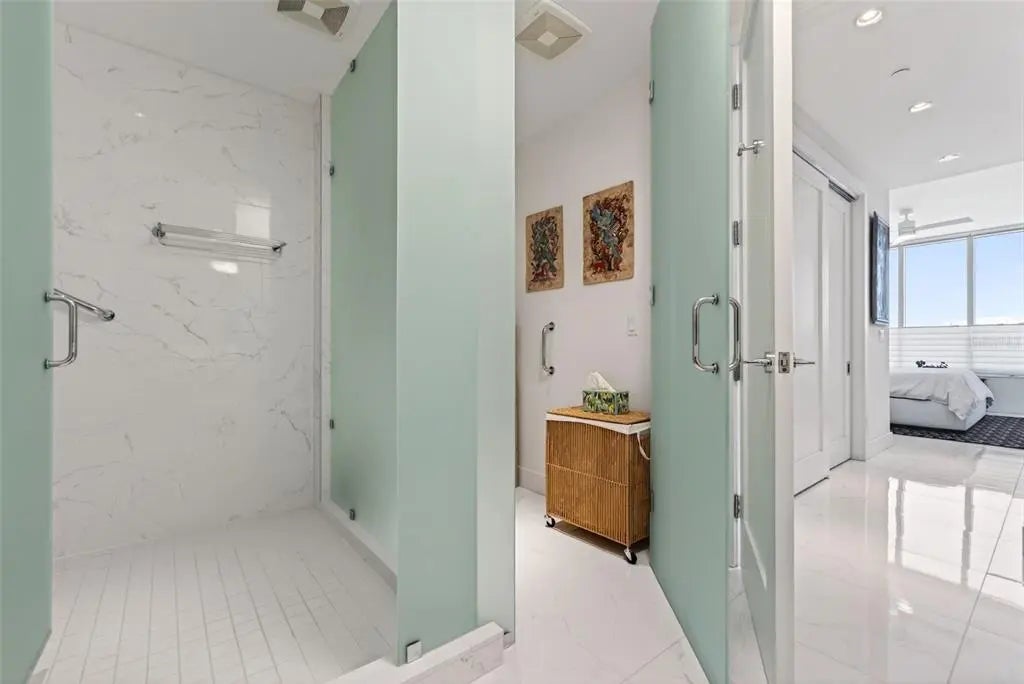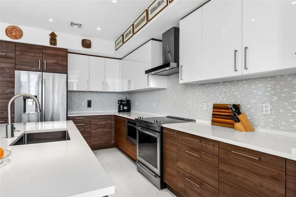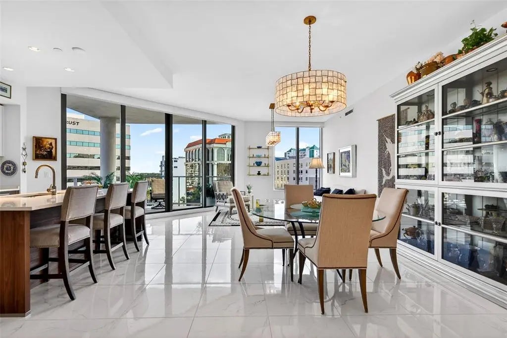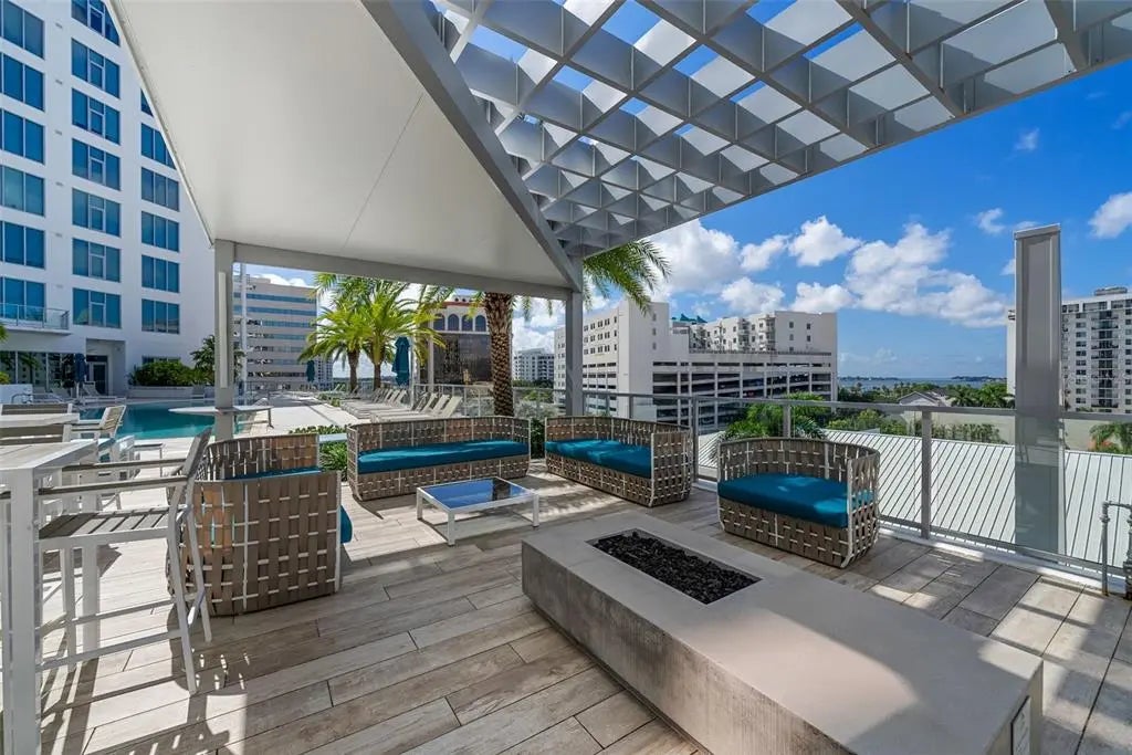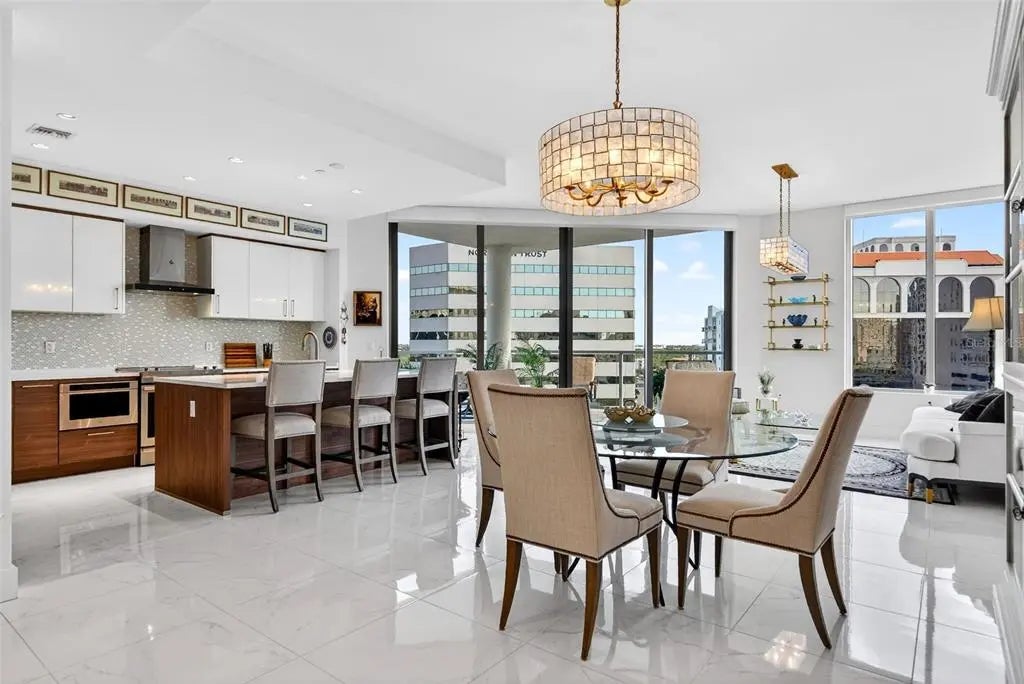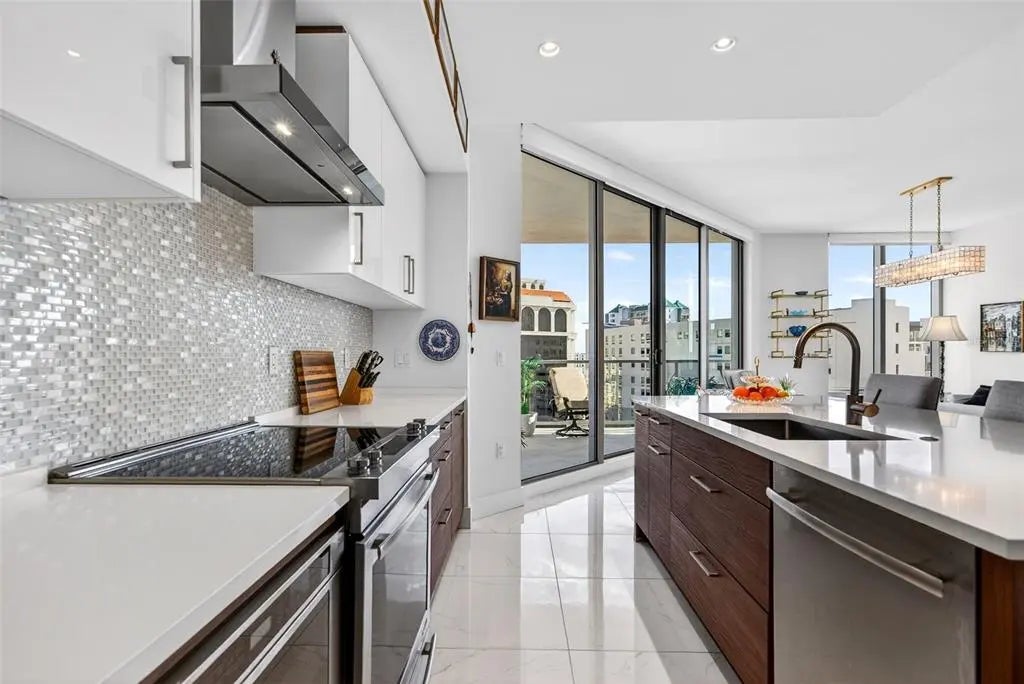 Experience refined downtown living at Sarasota’s premier address, The Mark. This 8th-floor end unit offers 2 bedrooms plus a den, 2.5 bathrooms, and abundant natural light with a desirable south-facing terrace and additional east and west views. The thoughtfully designed floor plan features two private terraces, including a unique triangular terrace off the main living area and a second terrace off the primary suite. Interior highlights include porcelain tile and engineered hardwood flooring, a spacious walk-in closet with custom built-ins in the primary bedroom, custom built-ins in the guest bedroom, and remote-controlled shades throughout. The kitchen showcases a modern European design with glossy white upper cabinetry, wood-grain lower cabinets, a full-height backsplash, and top-of-the-line appliances. Enjoy unmatched walkability with shops, restaurants, and galleries just steps from your door, offering the ultimate downtown Sarasota lifestyle.