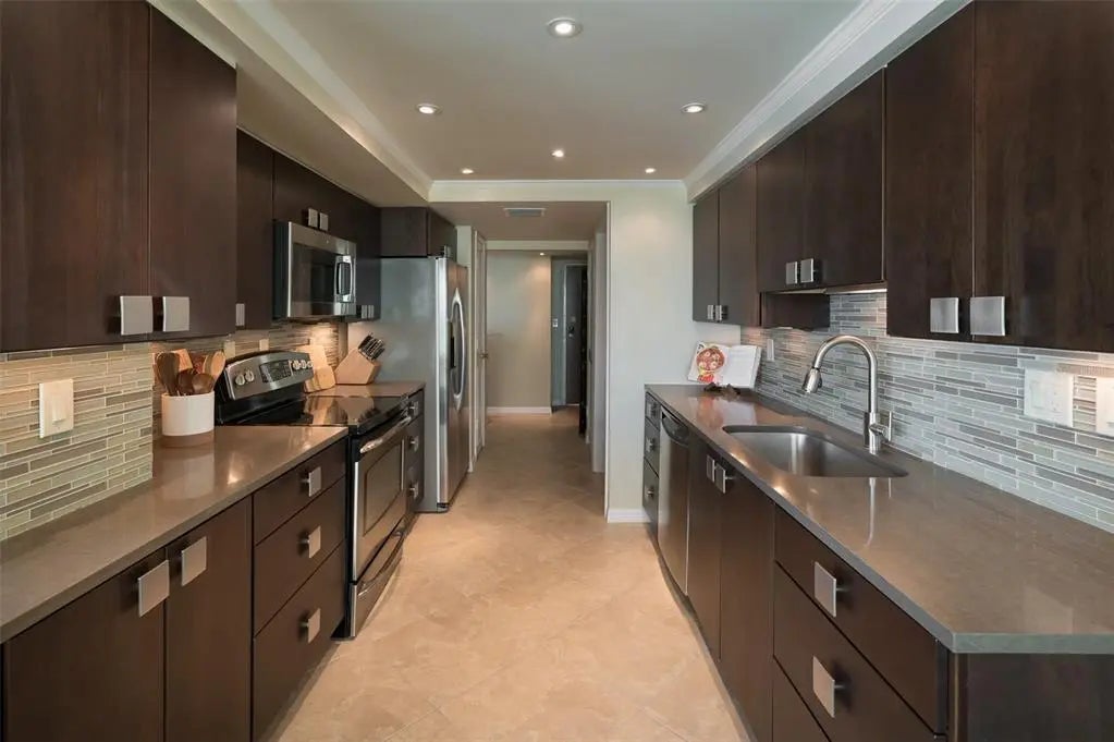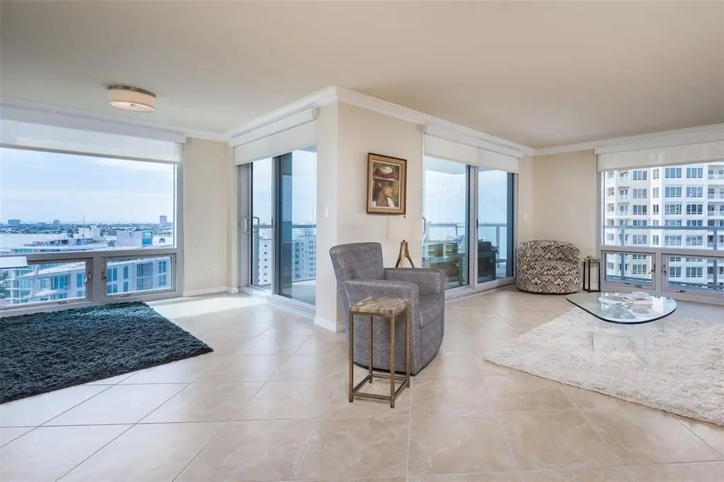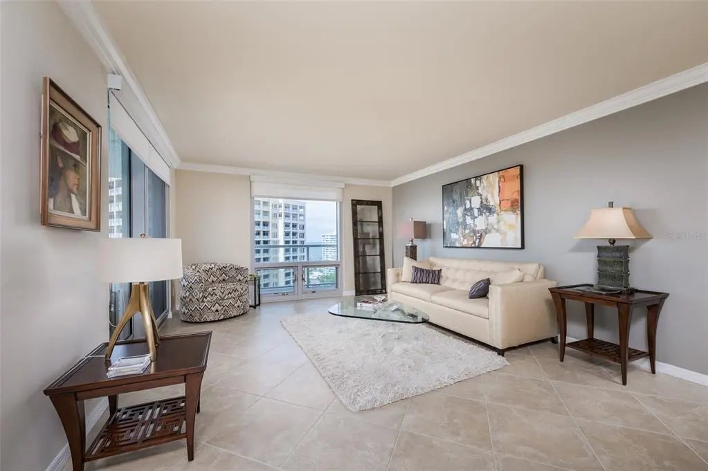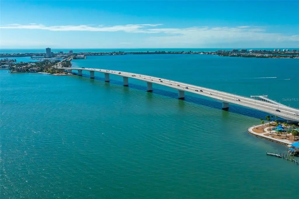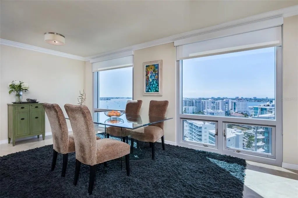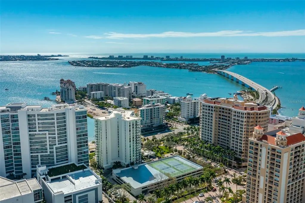 Under contract-accepting backup offers. Stunning 16th-floor corner residence at One Watergate offering panoramic views of Sarasota Bay, the iconic Ringling Bridge, and the downtown skyline. Walls of glass and a rare wraparound balcony seamlessly extend the living space outdoors, capturing sunrise-to-sunset vistas from every room. The light-filled open floor plan features a modern kitchen with a streamlined design that opens to spacious living and dining areas—ideal for entertaining or relaxing while taking in the ever-changing views. Both bedrooms capture city and bay views, and provide versatile spaces for relaxation, guests, or home office. One Watergate is in the midst of an exciting transformation, with the lobby, fitness center, and community room being refreshed in a clean, refined aesthetic. Resort-style amenities include a heated pool, outdoor grilling and gathering areas, and tennis courts. Exceptional downtown location steps to Sarasota’s waterfront, marina, dining, shopping, and performing arts venues—with St. Armands Circle and Lido Beach just over the bridge.